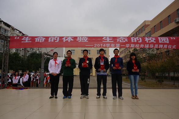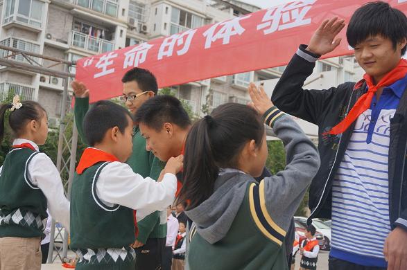 随后交大附属实验小学的教师代表为志愿者代表们颁发聘书,交大附小的小朋友们为志愿者代表们佩戴红领巾,最后双方学校师生合影留念。