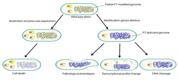 表观遗传学修饰如DNA甲基化修饰经常通过限制修饰系统,与细菌的自我防卫机制紧密相关。所谓“限制修饰系统”是原核生物在进化过程中形成的遗传信息保护机制。“限制”如同特殊的刀,而“修饰”好比定制的盾。当细菌被入侵后,外来的DNA会被“限制”消灭,自身的DNA由于被“修饰”而得到保护。经典的甲基化限制修饰系统中,一旦“修饰”被破坏,“限制”会无节制的破坏细菌DNA,最终导致细菌的死亡。