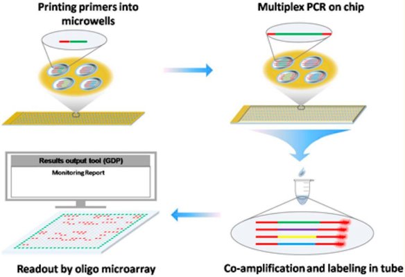 截止2012年底,约1.7亿公顷300多种转基因作物在全球28个国家商业化种植。如何从复杂样本中对众多的转基因作物进行快速有效的检测和标识,在技术上是一个重大挑战。为此,人们发展了众多不同类型的检测技术,但其中绝大多数只能检测很少一部分转基因靶标。迄今为止,仍没有任何一种技术或方法能在一次反应中实现对所有转基因作物的全局性检测。在课题组前期发展的一套基于亲疏水微孔芯片的多重PCR技术(Li,et al.,Lab Chip,2011,11,3609)的基础上,课题组实现了一张微芯片上同时扩增上百种转基因靶序列,靶序列扩增产物由另一张包含所有识别靶序列的寡核苷酸探针DNA芯片解读出来。本技术检测的转基因靶序列远多于已有研究和报道,且系统具有极好的扩展性,检测通量可根据需要进一步提高。大量实际样本检测结果显示本方法具有高特异性和灵敏度,检测准确率达到99%以上。同时,建立的双芯片系统还可以用来监测未知的转基因产品成分。目前该课题组正进一步对双芯片系统进行系统性简化,相信在转基因检测领域能很快发挥实际作用。该技术具有较强的通用性,可用于其它高通量核酸检测,如传染病和遗传病的高通量筛查等。