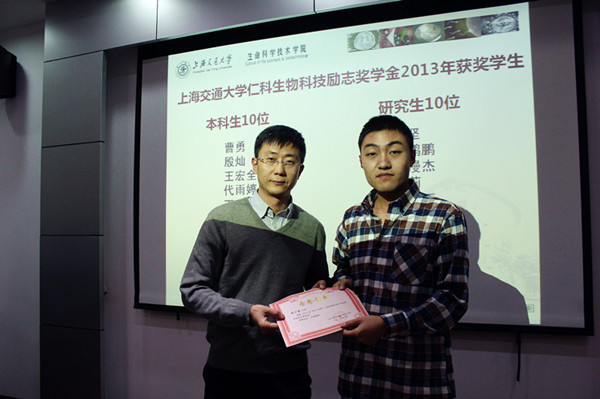 邱雁南为本次20名奖学金获得者颁发证书,并与获奖者合影留念。本科生获奖代表张少博发表获奖感言,感谢邱学长对母校学生的帮助,感谢这四年来社会各界人士以及学校、学院对自己的资助与鼓励,并祝愿学长在事业上蒸蒸日上;研究生获奖代表杨国环向所有获奖同学发出倡议,承诺工作后将秉承交大饮水思源之精神,尽己所能帮助母校学子。