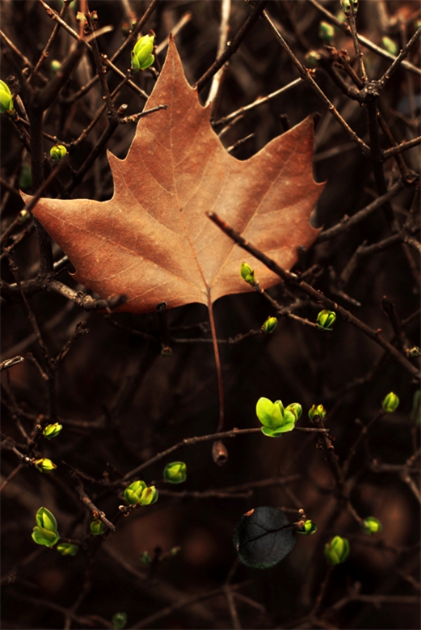 描述:冬末春初,枯黄的叶脉间透露着沧桑的气息,然而,落叶在新叶的烘托下似乎又有了生的希冀。此情此景,让人不禁感动于生命的生生不息,肃然起敬。