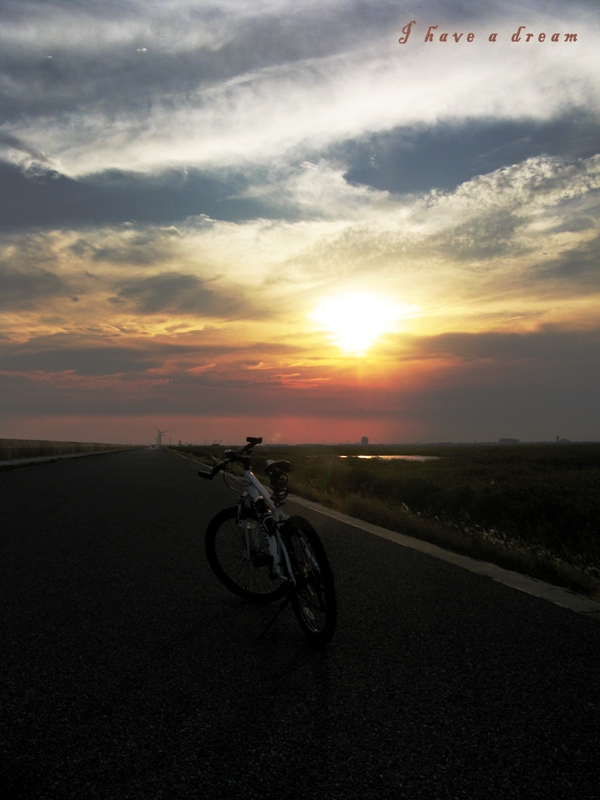 描述:此图摄于南汇嘴一条沿海的公路。图中通往远方的路上,一辆自行车正迎着夕阳,象征对至纯之信仰的执着追求