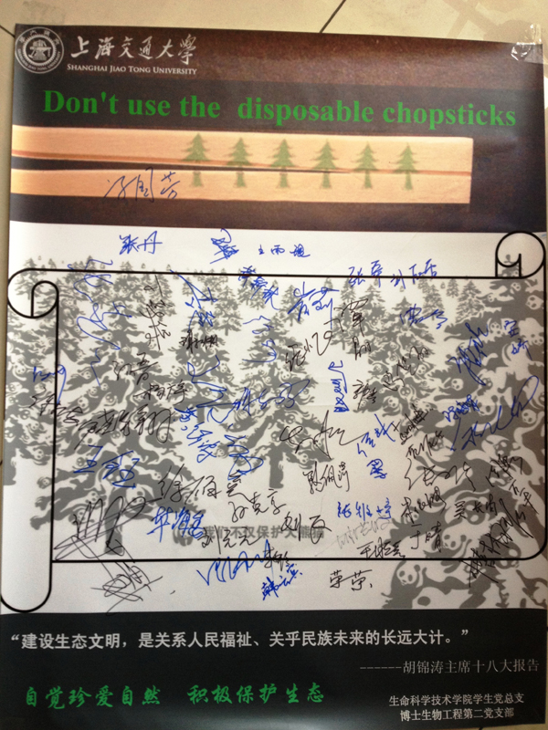 36365线路检测登录入口学生实验繁忙,许多同学没有时间去食堂吃饭,于是叫外卖,加上许多实验室组会,或者学生例会之类活动后的外卖,每年消耗很多一次性筷子。借十八大将生态文明建设提高到前所未有的地位这个契机,学生党员在生科楼下树华报告厅门前张贴起环保知识宣传海报,邀请路过的老师和同学填写简单的调查问卷,分发精心准备的筷勺套装,并以传单方式宣传十八关于生态文明建设的相关内容,号召大家拒绝使用一次性餐具。自觉珍爱自然,积极保护环境!