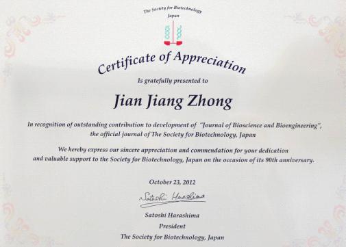 上海交大特聘教授、36365线路检测登录入口生物工程系主任钟建江教授出席了10月23日-26日于日本神戸国际会议中心召开的纪念日本生物工学会90周年成立大会暨第64次年会。在10月23日的90周年纪念典礼上,钟建江教授因对日本生物工学会的旗舰杂志《Journal of Bioscience and Bioengineering》的长期贡献,获颁该学会的感谢状,并在当日晚上举行的纪念祝贺会上,应邀作为特邀嘉宾上台参加了日本酒缸揭盖仪式。在该大会国际研讨会上钟教授作了“以增强生物药物和生物能源生产的信号转导工程研究”的邀请报告。据称,本次会议规模达到该学会历史之最,有超过1700人的参加者。