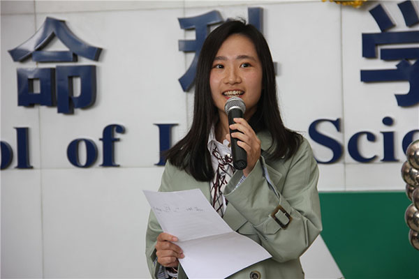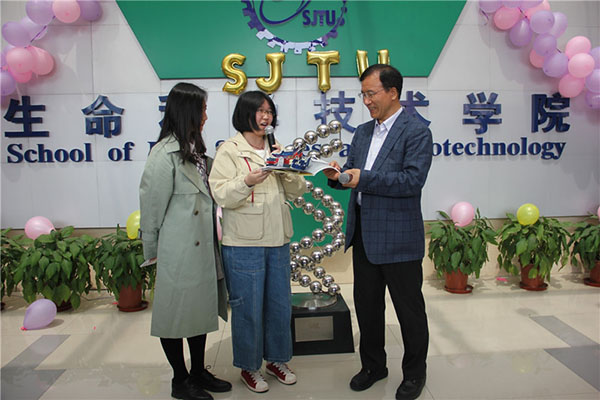学生代表乔于洋向学院赠送礼物,她亲手绘制了生科人工作的场景,生物药学大楼、PCR仪等,并将其做成立体画册,她感谢学院为大家提供了良好的学习和成长环境,祝愿学院桃李满天下。