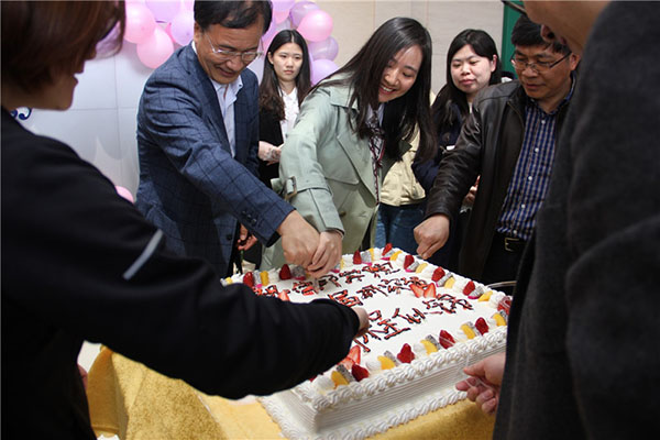 学院领导、导师以及学生代表在大家的欢呼声中切开了寓意“前程似锦”的蛋糕,毕业生们向现场的老师送去蛋糕,传达浓浓的不舍与温馨的师生情。