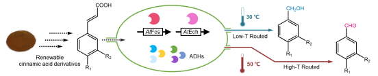 研究团队创新性地将嗜热菌的芳香醛合成酶基因导入中温宿主中,构建了温度导向的全细胞催化体系。在低温时,该催化体系在外源功能酶和内源醇脱氢酶的共同作用下可以将可再生资源阿魏酸转化为香草醇;随着温度的提高,中温宿主内源的醇脱氢酶活性受到抑制,而嗜热菌来源的功能酶活性得以保持,阿魏酸被高效转化为相应的芳香醛香兰素。随后,基于相同的策略,用多种肉桂酸衍生物作为底物合成了相应的芳香醛/芳香醇。这种全新的策略避免了对宿主内源醇脱氢酶敲除的繁琐过程,直接利用温度来控制了芳香醛/芳香醇的合成,极大的简化了生产过程,可以推广至许多其他醛类和以醛类为中间物的化合物的合成,具有重要的现实意义和工业应用价值。