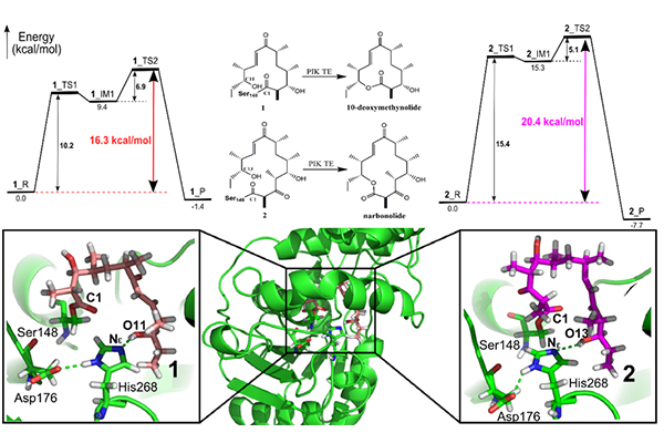 研究团队构建了苦霉素pikromycin的两种天然底物(十二元环10-deoxymethynolide(1)和十四元环narbonolide(2))所对应的研究体现(PIK-TE-1和PIK-TE-2),运用分子动力学模拟(MD)、量子力学与分子力学联用的QM/MM方法,分析了两种底物形成“预反应态(PRS,prereaction state)”的难易程度,发现PIK-TE-1体系比PIK-TE-2体系更容易形成稳定的预反应态。同时,预反应态的结构特征分析表明,氢键和疏水相互作用在底物识别和产物释放过程发挥了重要作用。此外,通过反应势能面的计算发现,PIK-TE-1体系环化过程中底物末端羟基从re面方向亲核进攻的环化反应能垒为16.3 kcal/mol,比从si面进攻的能垒要低3.6 kcal/mol,而相比于PIK-TE-2体系的re面进攻的反应能垒低4.1 kcal/mol,这与实验结果相符。