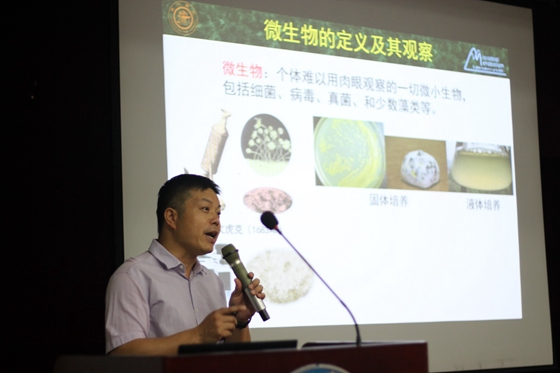 实验室副主任白林泉教授代表国家重点实验室对大家的到来表示了热烈的欢迎。白教授向大家介绍了实验室和学院的基本情况,充分地展示了国重室近年来在微生物合成代谢、分解代谢、代谢互作三个主要研究方向取得的一系列具有国际影响力的研究成果。在主题科普讲座中,白教授从重要药物研制入手,以科研工作者的视角,讲述了合成生物学这门新兴学科和技术如何改变着身边物、牵动着热点事,为观众们拨开了代谢科学的神秘面纱,带领大家一起领略了合成生物学的神奇创造力及其巨大潜力。讲座由浅入深、生动有趣,获得了听众交口称赞,也激发了大家浓厚的科学兴趣。大、小朋友们接二连三的提出问题,白教授都一一进行了耐心细致的解答。讲科学、爱科学的氛围洋溢在活动现场。