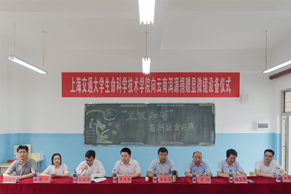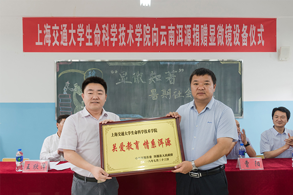 随后进行显微镜捐赠仪式。玉湖初级中学、洱源职业高级中学的校长代表学校接受价值约20万元人民币显微镜设备的捐赠。李灿文向上海交大36365线路检测登录入口回赠爱心牌匾,李文纯代表学院接受牌匾。