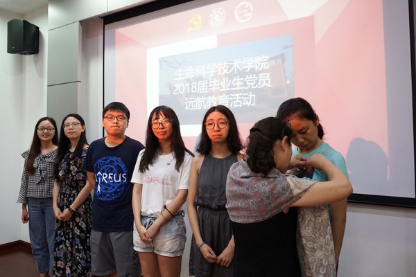 会议伊始,仰颐为六位学生党员佩戴党徽,以此激励党员同志强化宗旨意识和责任意识,要勇于亮出党员身份。随后,毕业生党员面对党旗重温入党誓词。
