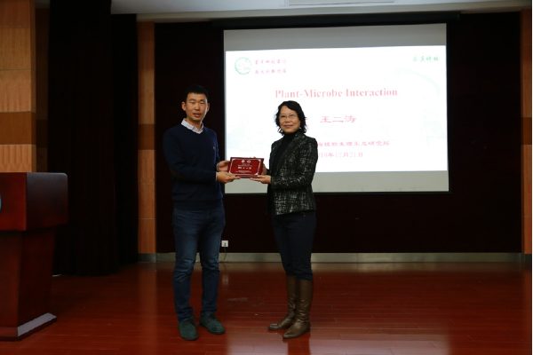 在提问讨论环节,参会者就共生的菌根真菌中的脂肪酸代谢途径是否缺失、土壤中除了磷以外的其他元素是否对共生也有影响等问题与王二涛研究员进行讨论和交流。学术讲座后,常务副院长冯雁向王二涛研究员颁发了演讲牌。