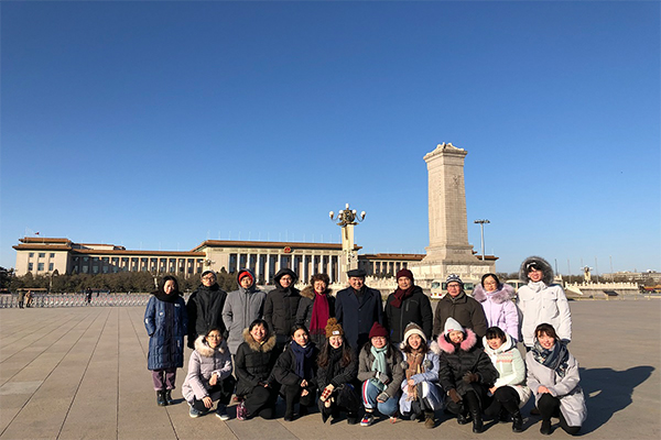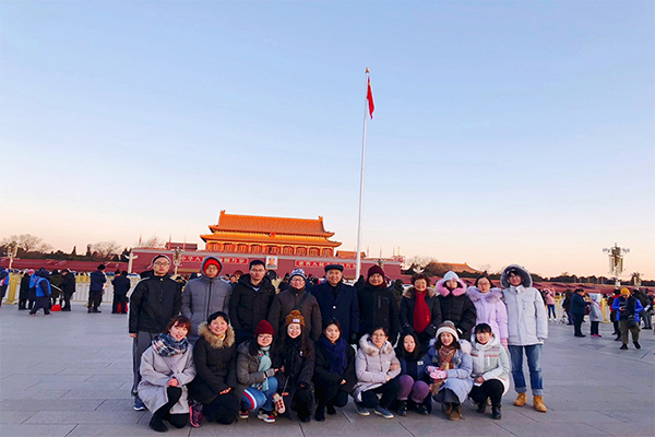 12月29日,19位师生聚集在天安门广场前,观看庄严的升旗仪式。城楼上嘹亮的军号响起,随着“正步走”的号令,护卫队员铿锵整齐的步伐走向国旗杆基座。师生们整齐肃立,高声唱起国歌。
