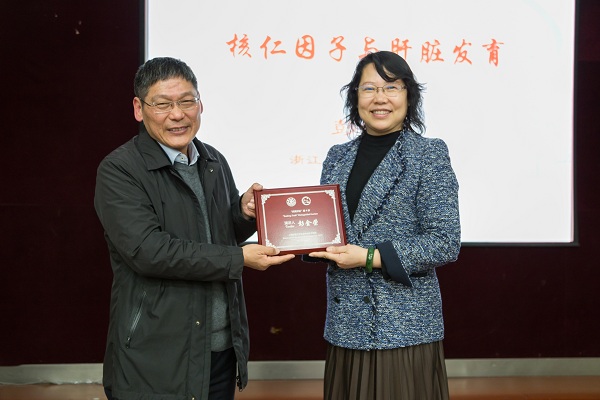 彭金荣教授的主要学术成就包括赤霉素作用的分子机理研究和以斑马鱼为模式动物研究肝脏发育和再生的分子调控机制研究。报告中,彭教授介绍了自己课题组在植物激素赤霉素信号传导领域开展了系统的研究工作,发表了20篇有重要影响的论文(包括Nature、Science),特别是已写进教科书的赤霉素“去抑制生长”的作用机制,为人们认识赤霉素作用的分子机制作出了重要贡献。接着,彭教授着重介绍了斑马鱼肝脏发育的调控机制。核仁具有“核中核”之称,彭金荣教授实验室以斑马鱼为遗传模式材料,研究肝脏早期发育的遗传调控机理,近十年来发现多个核仁因子参与调控肝脏发育。最近他们发现斑马鱼Mpp10和Sas10均是保守的核仁蛋白,并且对斑马鱼消化器官的发育至关重要,Mpp10和Sas10均参与18S rRNA的加工过程,Mpp10和Sas10从斑马鱼胚胎发育早期就开始形成稳定的复合体,并且这两个蛋白稳定性互相依赖。进一步研究发现Def通过与Sas10互作形成Def-Sas10-Mpp10复合体可能促进了CAPN3对Mpp10的降解,同时发现Sas10通过与Mpp10结合遮蔽Mpp10上CAPN3的识别位点从而保护Mpp10不被CAPN3降解。因此,在脊椎动物早期器官发育过程中,核仁蛋白Def,Sas10,Mpp10,Bms1l和Rc1l不仅参与18S rRNA的加工成熟,还在肝脏发育中起重要作用。