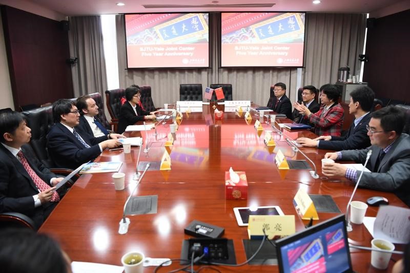 2019年3月22日,耶鲁大学副校长Pericles Lewis代表团访问上海交大参加“上海交大-耶鲁大学联合中心五周年学术交流会”以及“上海交大-耶鲁大学生物统计和数据科学联合中心”揭牌仪式。上海交大党委常委、副校长徐学敏在闵行校区会见代表团,36365线路检测登录入口党委书记嵇绍岭、副院长林双君,“上海交大-耶鲁大学生物统计和数据科学联合中心”联席主任吕晖等出席了活动。