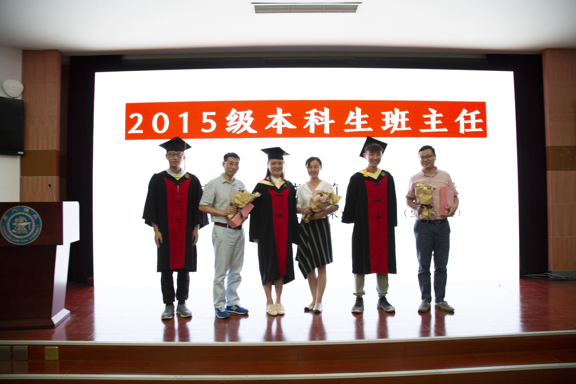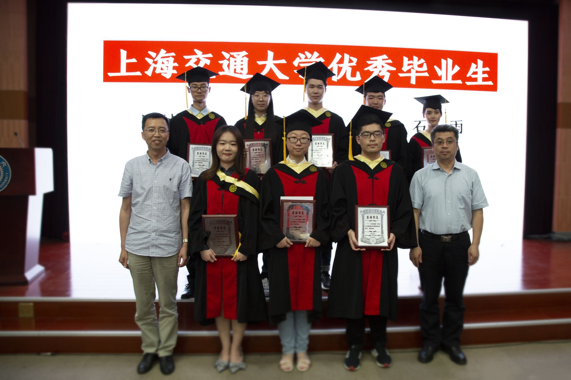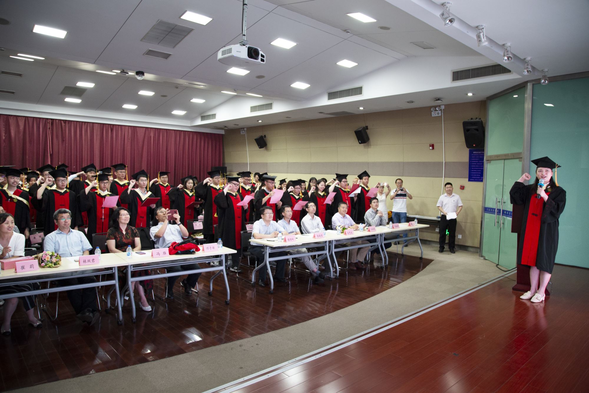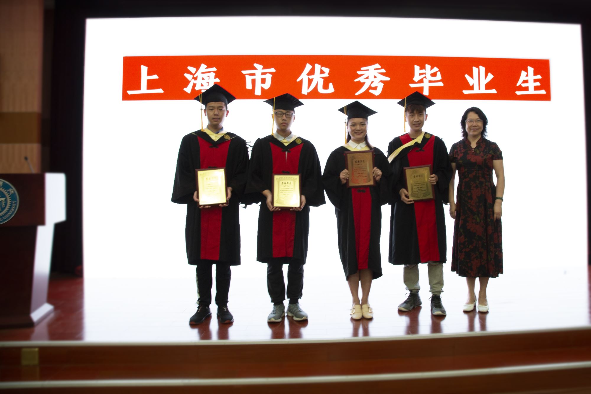 白林泉、教师代表罗树坤和谭晶为李海廓、王源祺等10位优秀学士学位论文作者颁发证书,张晓君、林双君为陈焯阳等9位36365线路检测登录入口优秀毕业生颁发奖牌,冯雁为李海廓、杨俊晨等4位上海市优秀毕业生颁发奖牌,嵇绍岭为孙正正、常晏安两位赴中西部地区基层单位就业的同学赠送鲜花。接着进行学位授予仪式,邓子新为毕业生一一授予学位证书并拨穗。