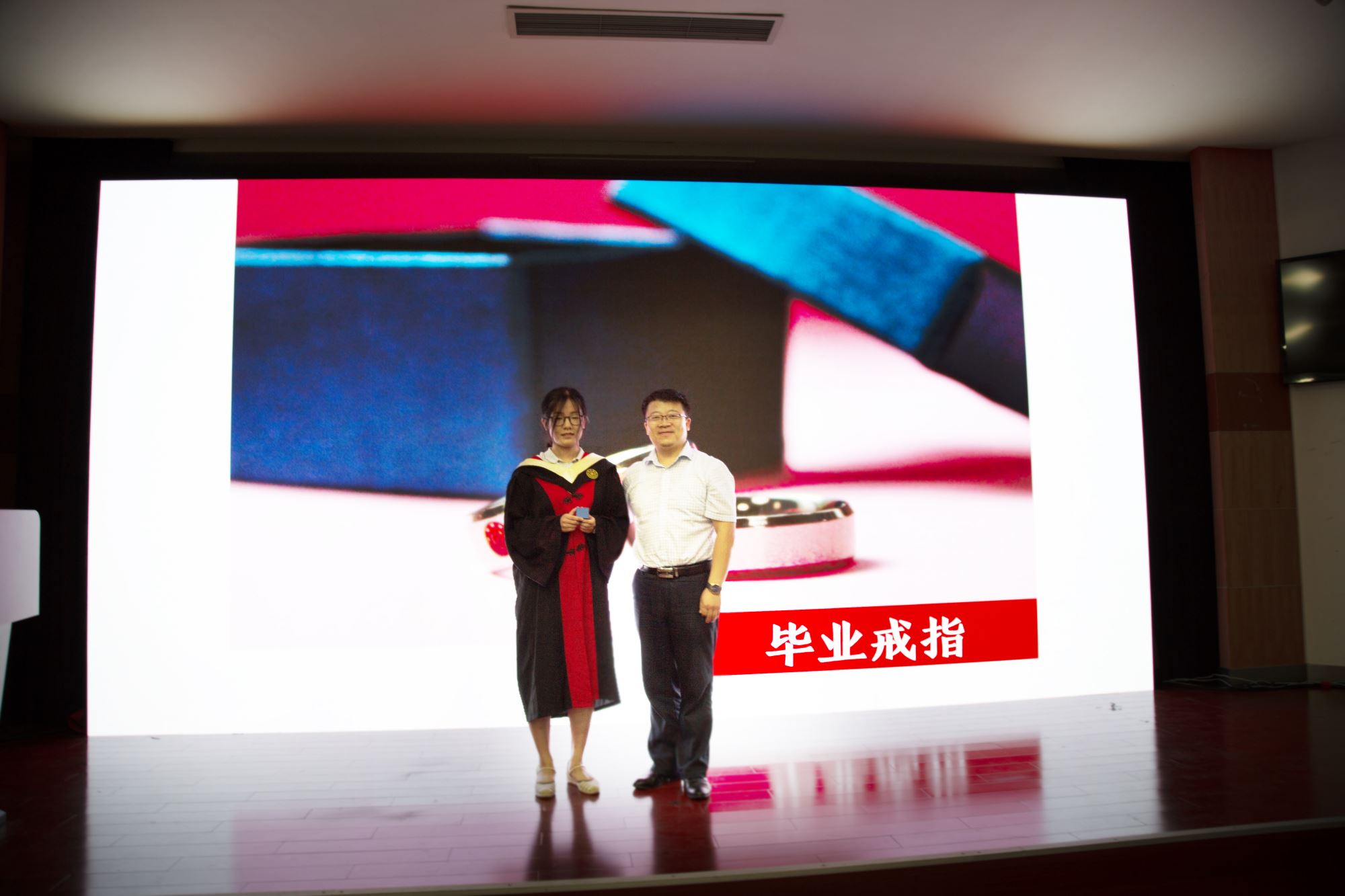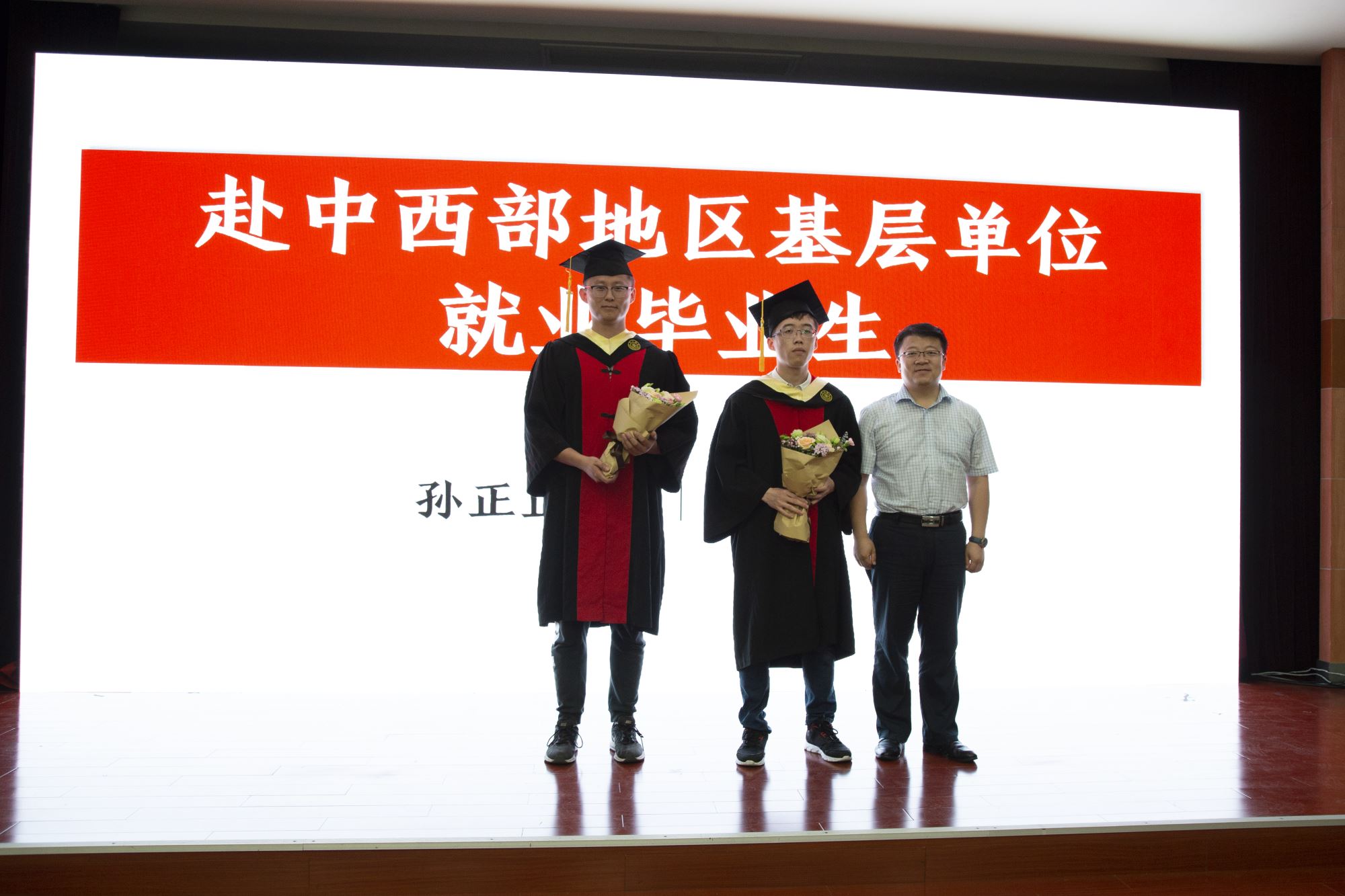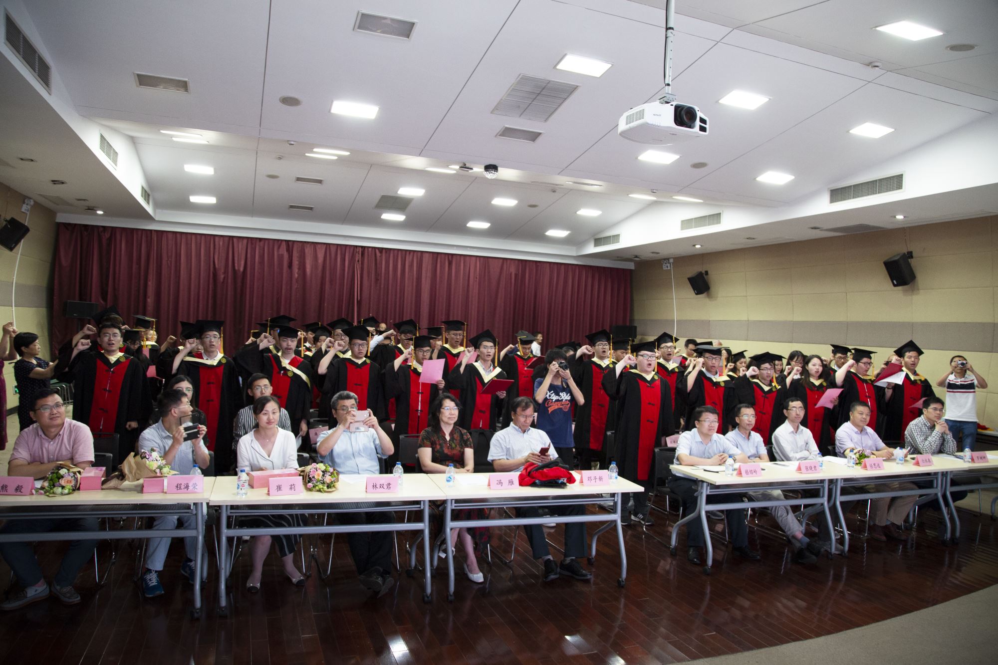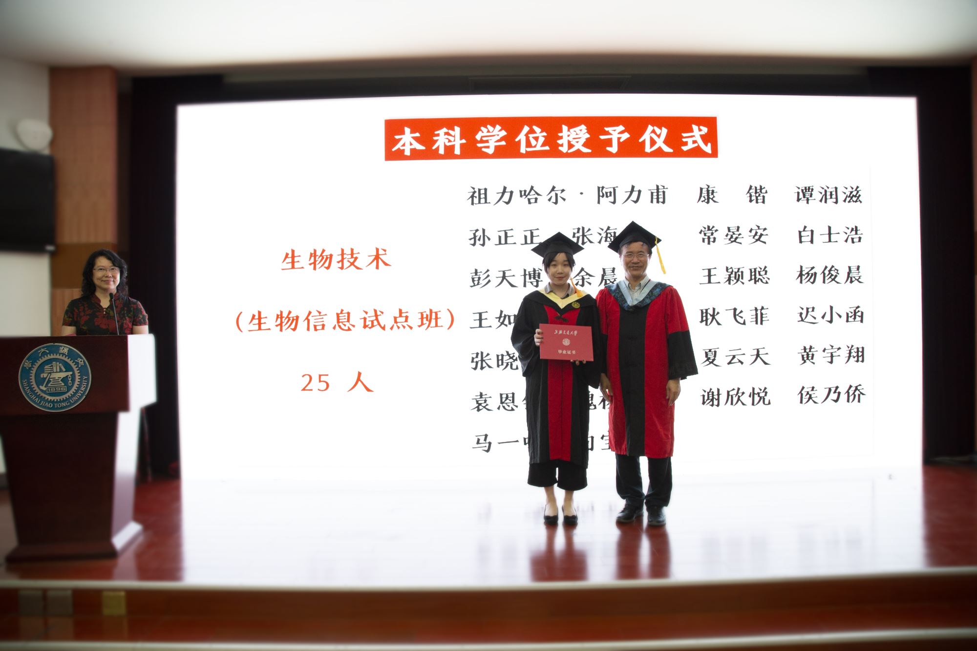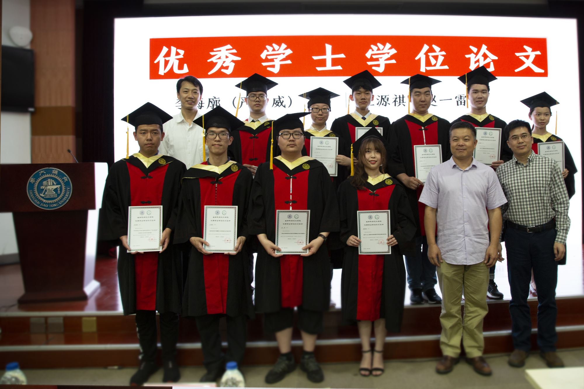 白林泉、教师代表罗树坤和谭晶为李海廓、王源祺等10位优秀学士学位论文作者颁发证书,张晓君、林双君为陈焯阳等9位36365线路检测登录入口优秀毕业生颁发奖牌,冯雁为李海廓、杨俊晨等4位上海市优秀毕业生颁发奖牌,嵇绍岭为孙正正、常晏安两位赴中西部地区基层单位就业的同学赠送鲜花。接着进行学位授予仪式,邓子新为毕业生一一授予学位证书并拨穗。