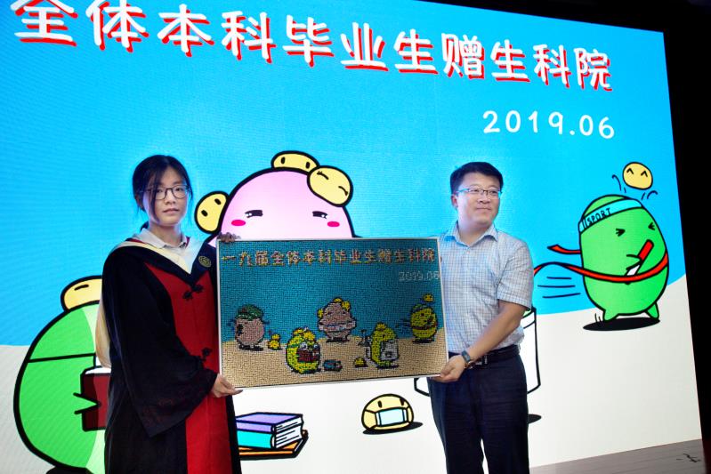 第二篇章感恩。视频《感谢有你》记录了毕业生对师长和亲友的诚挚谢意。左泽远等三位学生代表为2015级班主任献花并赠送礼物,感恩班主任对学生的无私关爱和教导。张晓萌代表全体毕业生向学院赠送离别礼物,该作品是由张晓萌原创设计、刘钰鸿等毕业生集体完成制作的“菌菌”主题图钉画《Proud of you》,张晓萌说道,“菌菌”是她做实验时候产生的灵感,“科创、学术、运动、歌唱、校友”五种形象的“菌菌”,代表了学生缤纷多彩的大学生活,“我们始终以学院为荣;终有一天,学院会以我们为荣。”嵇绍岭代表学院接受礼物,并向毕业生代表回赠纪念毕业戒指,希望毕业生们时时自戒自律、追求卓越,常念母院,祝愿毕业生们前程似锦,