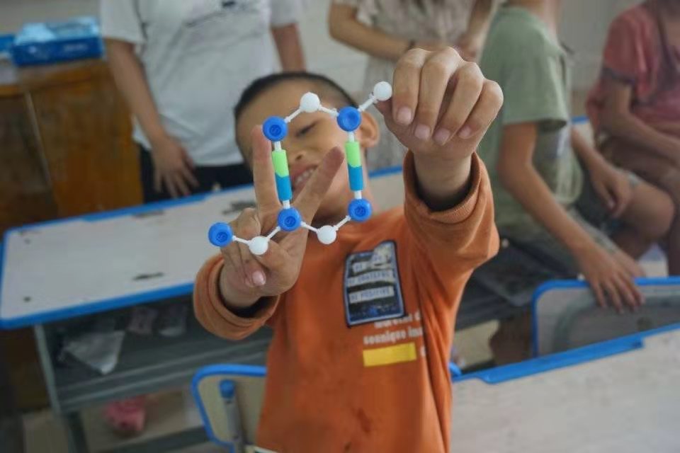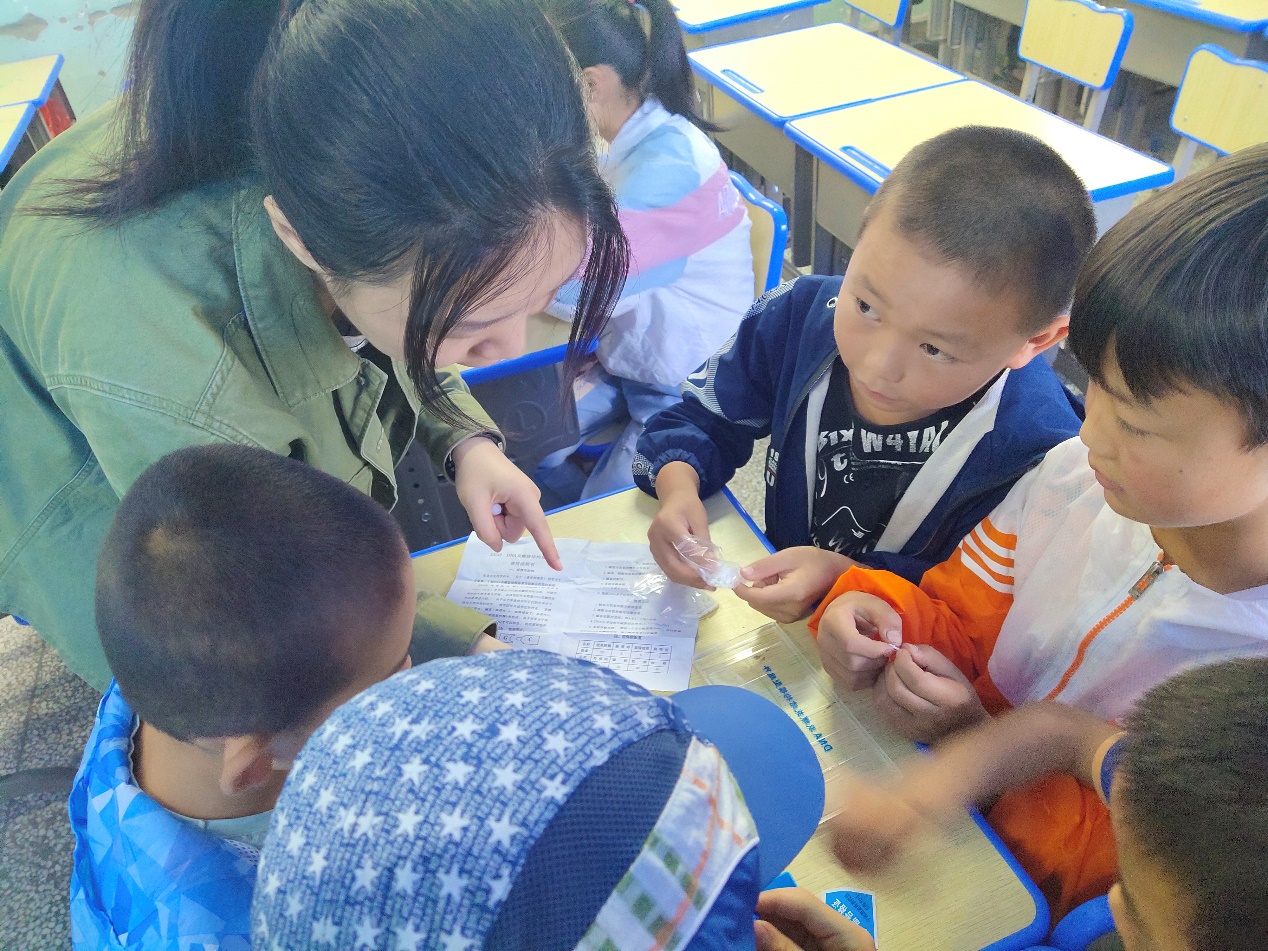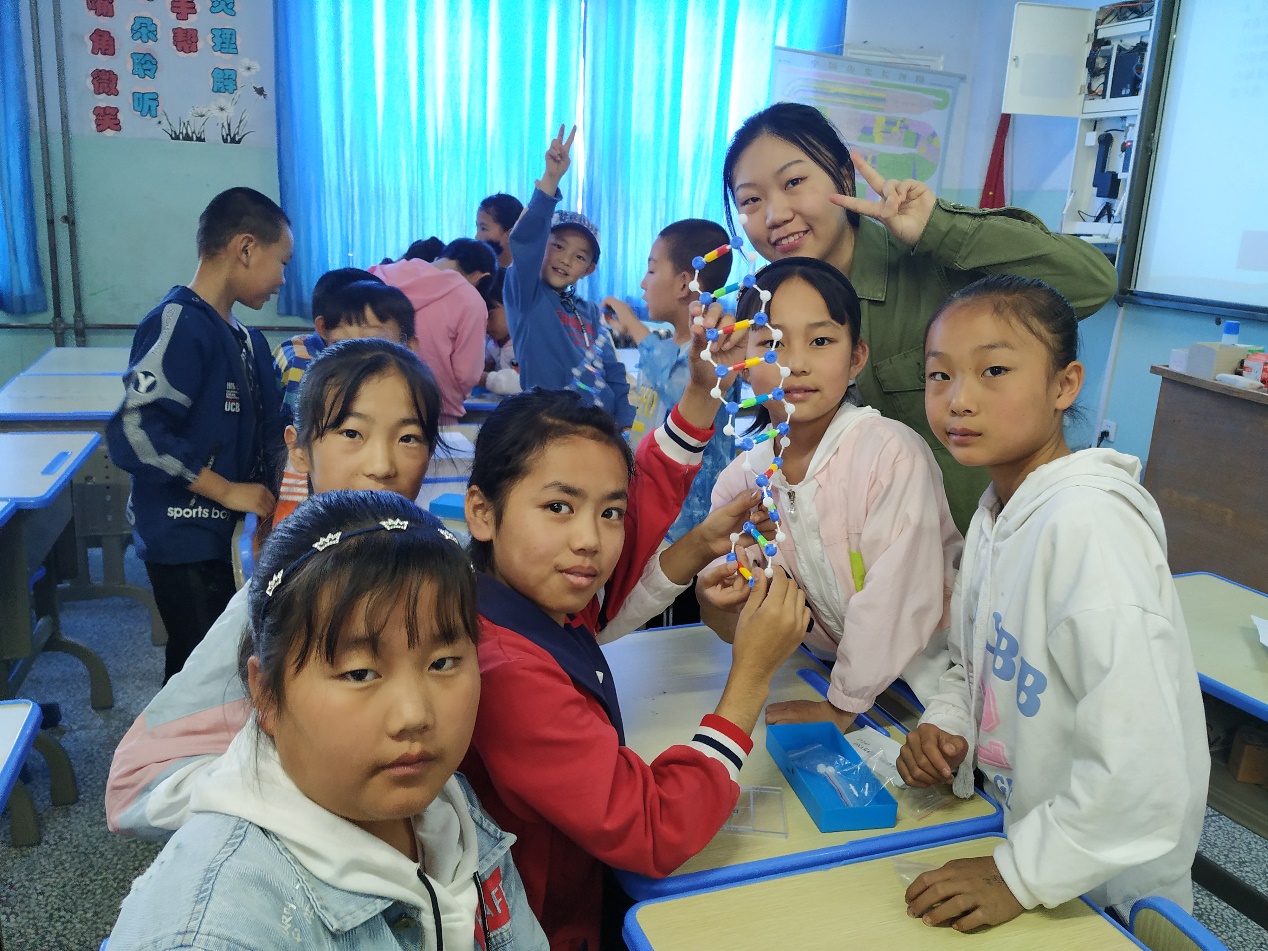 在青海省西宁市大通县长宁镇中心学校,实践团成员给三年级孩子教授了几节生物科普课,引导他们思考生命的本质,一起探索基因的奥秘。从最普遍的自然现象入手,引导孩子思考为什么“种瓜得瓜,种豆得豆”,又为什么“世界上没有两片相同的叶子”;迎着孩子们好奇的眼神,老师初步为他们打开了分子生物学的大门。分小组搭建DNA模型,孩子们进一步具象化地认识微观生物结构,而对于最前沿基因工程技术的介绍,更开发了孩子们的想象力。既沿着先人探索的脚印,回溯自身遗传的脉络,也启迪他们对于科学的研究热情,也许下一个生物学的重要发现,就将在他们中间诞生。