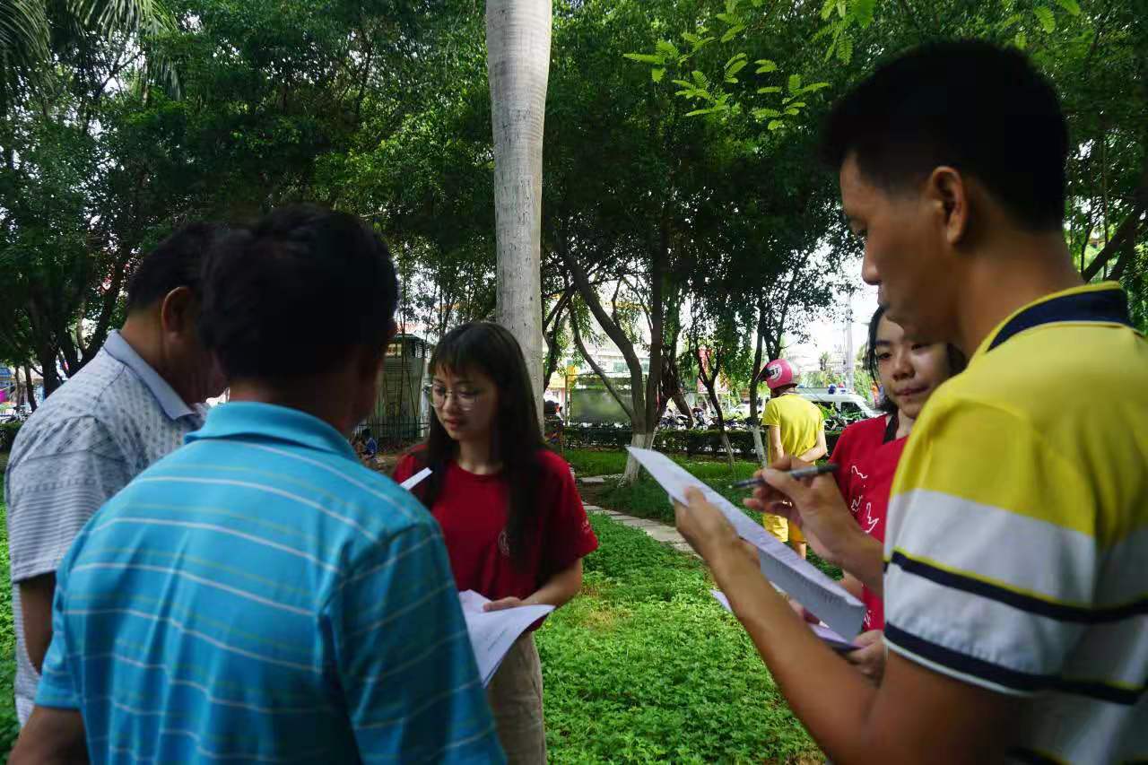 在8月1日至8月3日的社会调查阶段,iGEM队员在东方市八所镇街头进行了随机问卷发放和视频采访,针对于部分不识字的受访者则采用了iGEM队员口述题目后进行代填写的方式完成数据收集。在调查中实践团成员记录了不同人群针对于基因编辑的不同观点,为后续的统计与分析提供了更多的数据支撑。