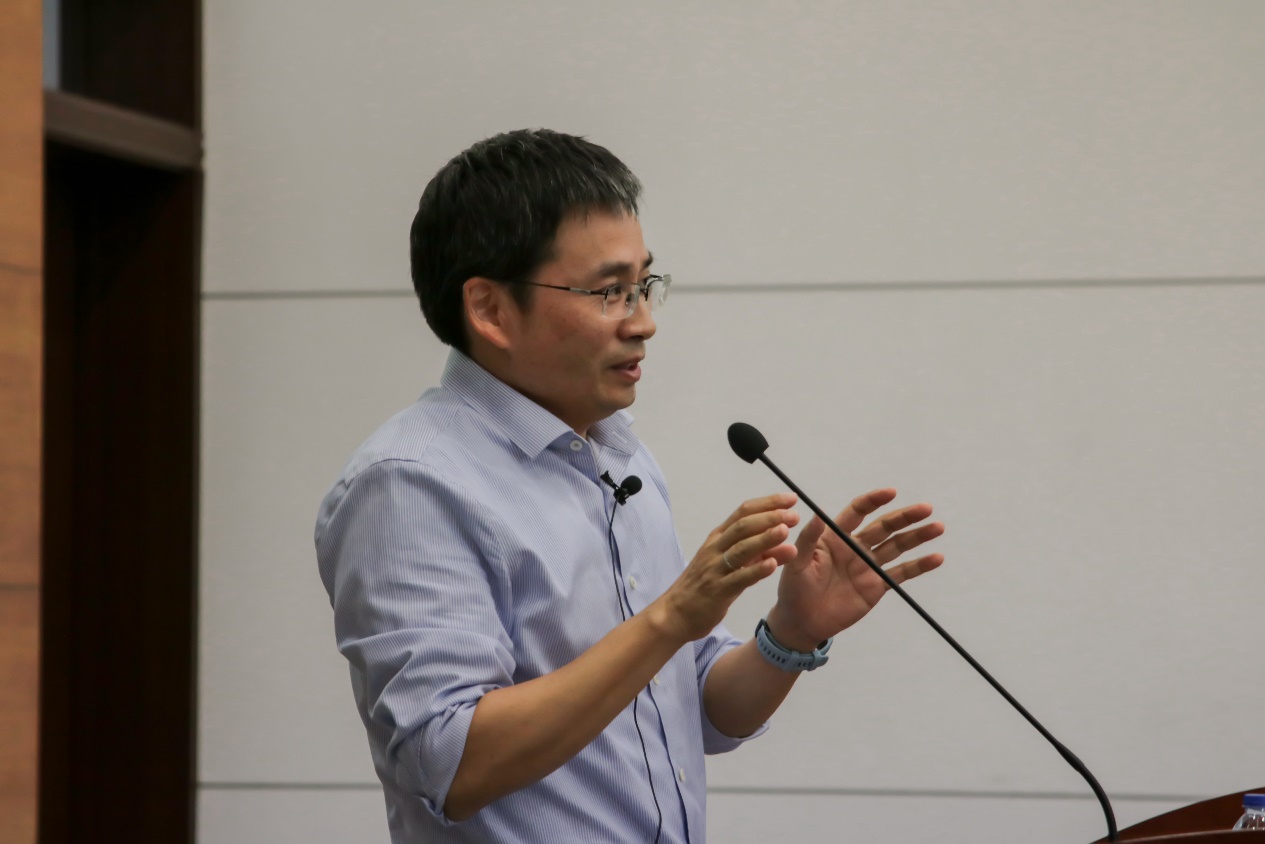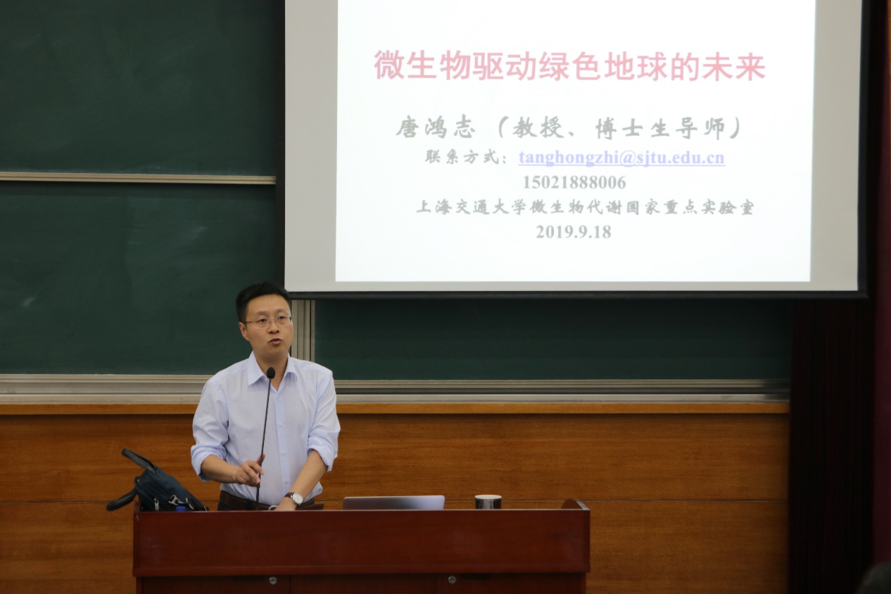 唐鸿志教授以“微生物驱动绿色地球的未来”为题,首先介绍了微生物科学的发展背景,阐述了生命科学的定义、目的、特点和上海交大生命科学的飞速发展历程。随后,他进一步介绍了生物产业经济的几大趋势,强调了微生物在生物地球化学循环中的核心作用和微生物资源的重要性,以通过构建人工菌群处理石油废水等实例给予同学们更直观的认识。他还从自己数年科研经历、经验出发,向本科生讲授如何做课题、如何进行科研成果的转化与应用等问题并分享了自己在MIT的经历和Alexander Rich的话“WHY NOT?”,鼓励同学们探索自己喜欢的领域。