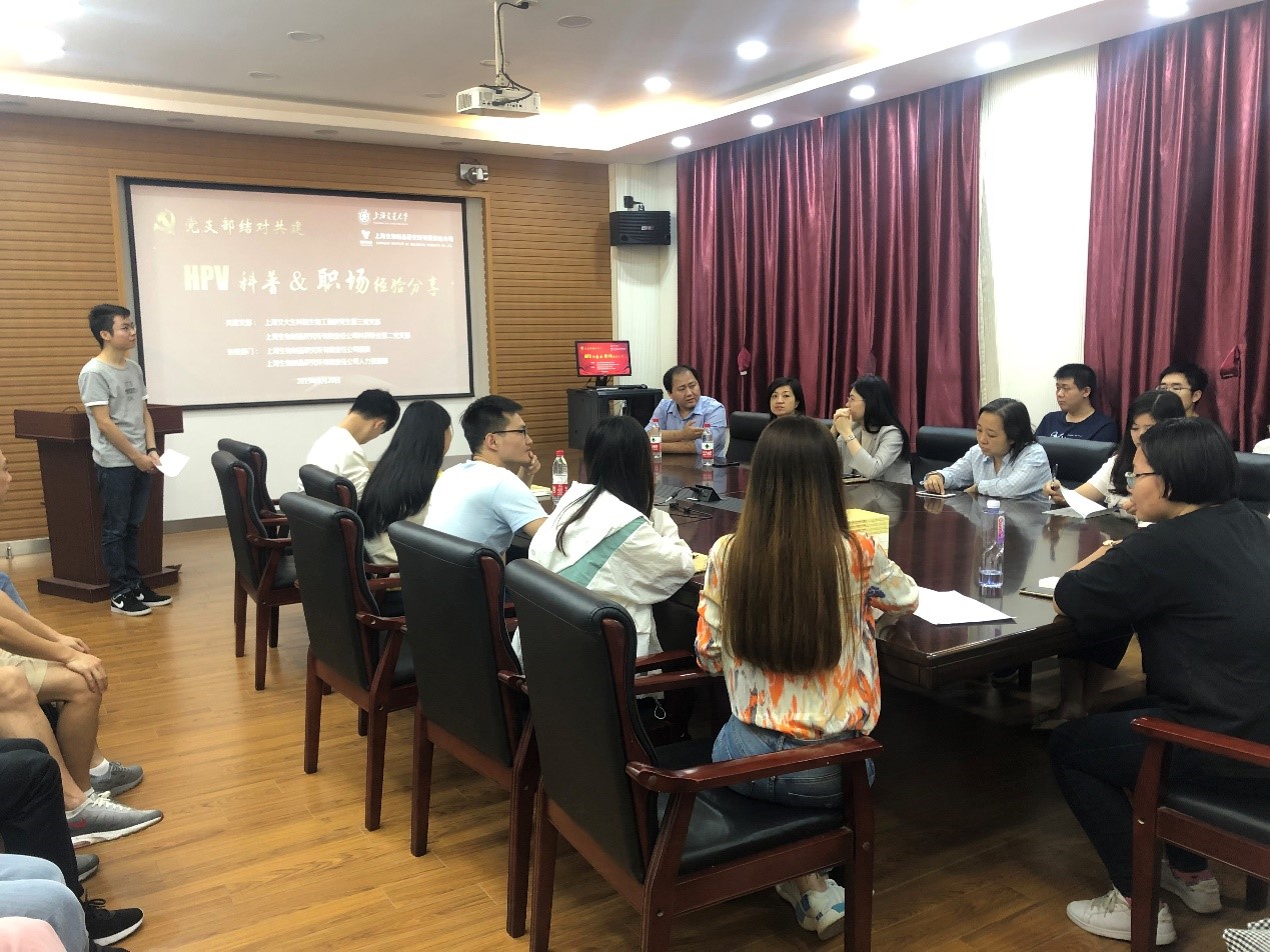 为进一步落实“共行计划”项目规划、丰富双方支部共建活动形式,发挥基层党支部战斗堡垒作用,2019年9月20日下午,36365线路检测登录入口生物工程研究生第三党支部与上海生物制品研究所有限责任公司科研第二党支部联合开展 “HPV科普及职场经验宣讲”共建活动,公司人力资源部经理曹婕、团委书记曹𣲗,及双方支部全体党员同志出席本次活动。