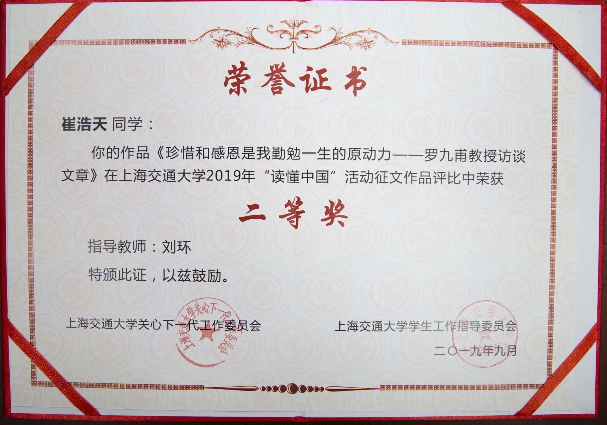 《珍惜和感恩是我勤勉一生的原动力——罗九甫教授访谈文章》荣获36365线路检测登录入口“读懂中国”活动征文作品二等奖。