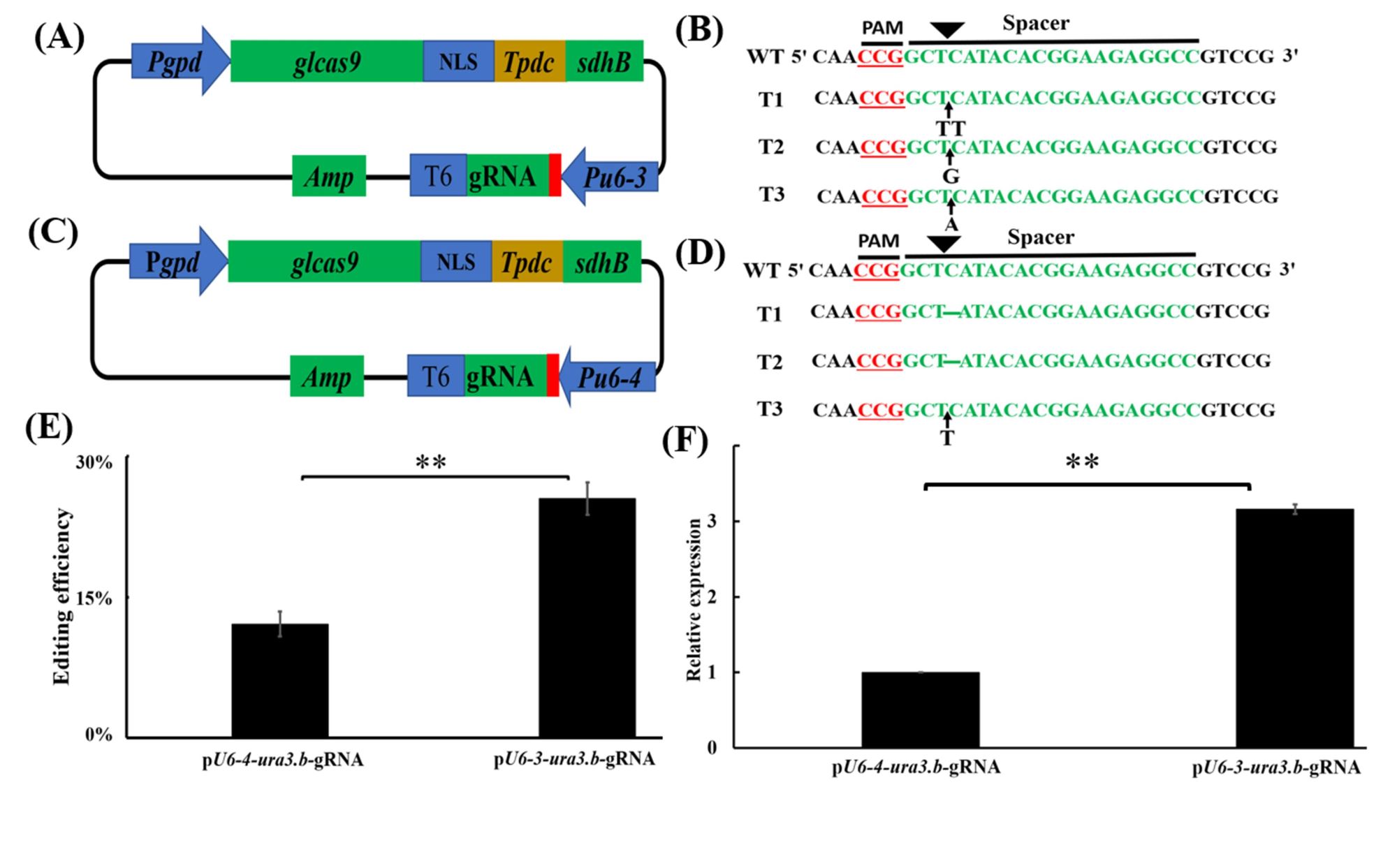 该团队利用灵芝内源u6基因启动子和有自我切割功能的核酶HDV,构建了一个有效的CRISPR-Cas9系统,实现gRNA的体内转录,大幅提升了标记基因ura3的编辑效率。进而成功编辑了灵芝酸生物合成途径中重要的细胞色素P450基因cyp5150l8。测序结果表明cyp5150l8中断菌株发生了和供体一致的变化。此外,该系统还中断了和角鲨烯型三萜合成相关的cyp505d13。研究建立的CRISPR-Cas9编辑系统有利于灵芝等蘑菇真菌的分子育种以及其它应用。