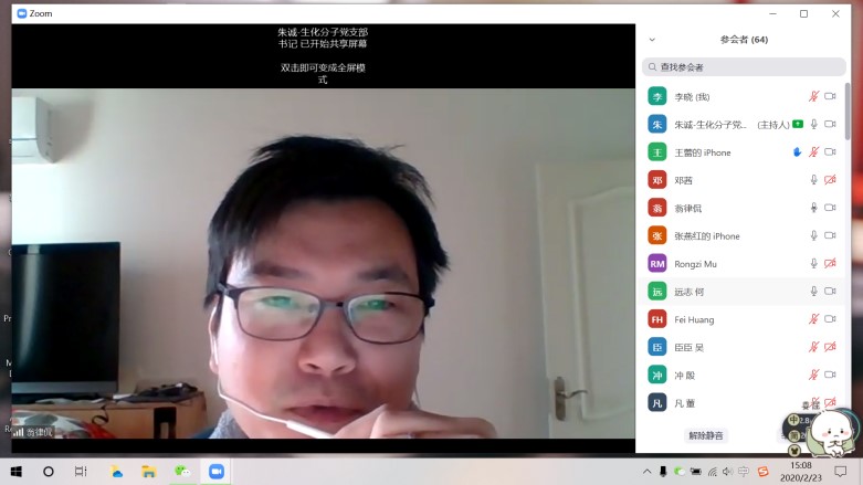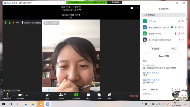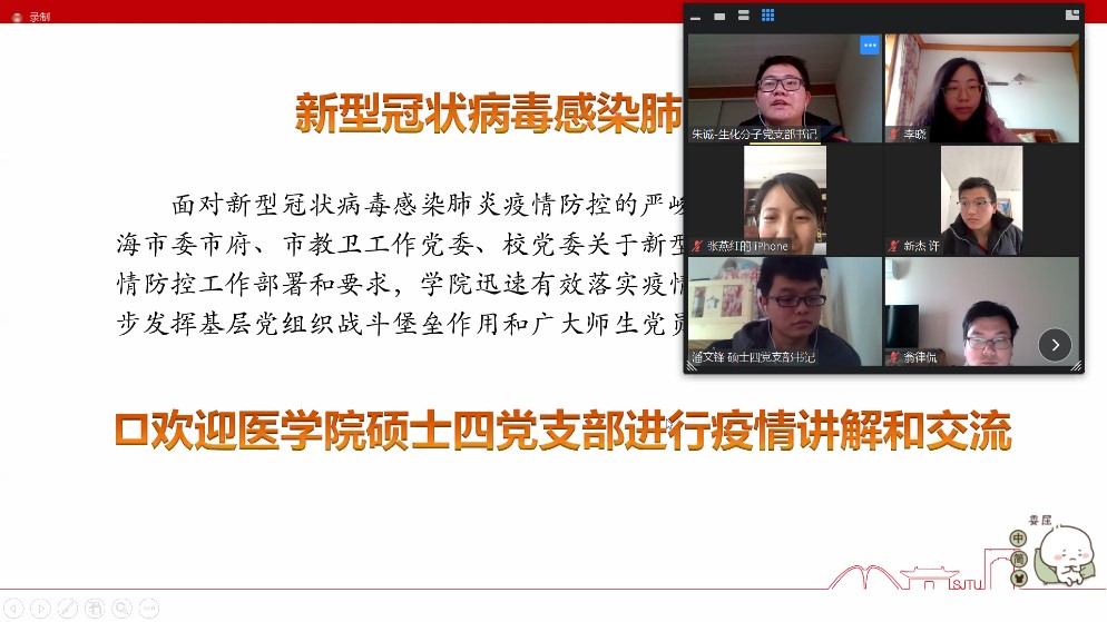 2020年2月23日,针对目前新型冠状病毒肺炎疫情防控的严峻形势,36365线路检测登录入口生物化学与分子生物学系研究生党支部与医学院硕士第四党支部联合召开线上专题组织生活会。医学院研究生办公室主任翁律侃、辅导员杨璐,36365线路检测登录入口学生党总支书记张燕红、特邀党建组织员陆秀英及两个支部72位学生党员共同参会,会议由生化系研究生党支部书记朱诚主持。