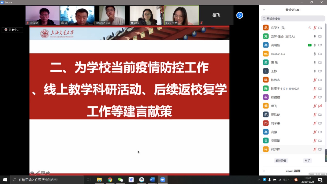 刘环老师首先了解各位同学目前的学习生活状况,与疫情严重地区同学就生活现状进行了深入交流。同时也传达了学校的防控工作方案和线上授课工作安排,希望同学们能够缓解焦虑,积极向上,在居家环境中做好工作,共同抗疫。