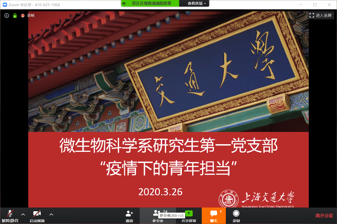 2020年伊始,新冠肺炎疫情的蔓延使得中国乃至全世界打响了一场没有硝烟的战争。众多青年主动请缨,和英勇奋战的一线防控人员一起参与到疫情的防控中,为抗击疫情贡献了自己的力量。3月26日,36365线路检测登录入口微生物科学系研究生第一党支部在zoom平台上以“疫情下的青年担当”为主题召开了支部会议,支部21名正式党员和3名预备党员参加了本次会议。