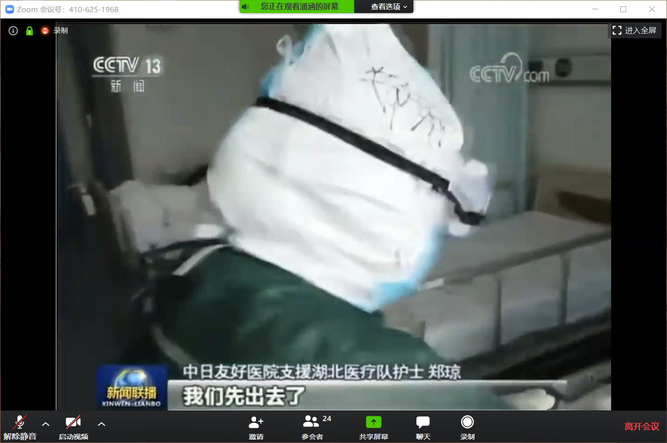 接下来,支部成员观看了关于援鄂医疗队和志愿者的视频,包括新闻联播对于支援湖北医疗队护士郑琼、社区志愿者余汉明等抗疫一线工作者的报道,以及90后医护人员惠亮亮的“援鄂日记”等,进一步加深了支部成员对于抗疫中青年人责任担当的感悟。看完视频后,潘涵进行了总结:在这次抗击疫情的斗争中,广大青年以实际行动,主动承担起急难险重的任务,他们选择了无惧无畏,热血担当;选择了战疫有我,毅然前行;书写着中国少年的崭新篇章,真正践行了“苟利国家生死以,岂因年少旁观之”的道理,值得我们广大青年学子敬佩和学习。