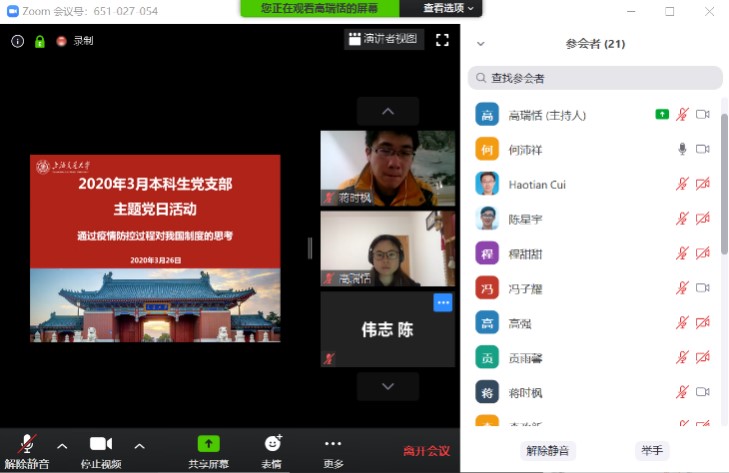 当前,在全球应对疫情的形势下,中国树立了抗击新冠肺炎疫情的榜样,我国疫情防控经验为世界提供了重要借鉴。3月26日,36365线路检测登录入口本科生党支部依托zoom在线平台,开展了以“基于疫情防控过程对我国制度的思考”为主题的线上党日活动,从制度出发,分析疫情防控的政策与成效,在思考与交流中进一步坚定“四个自信”。本科生党支部书记刘环、辅导员岳鑫及支部23名党员同志参加会议。