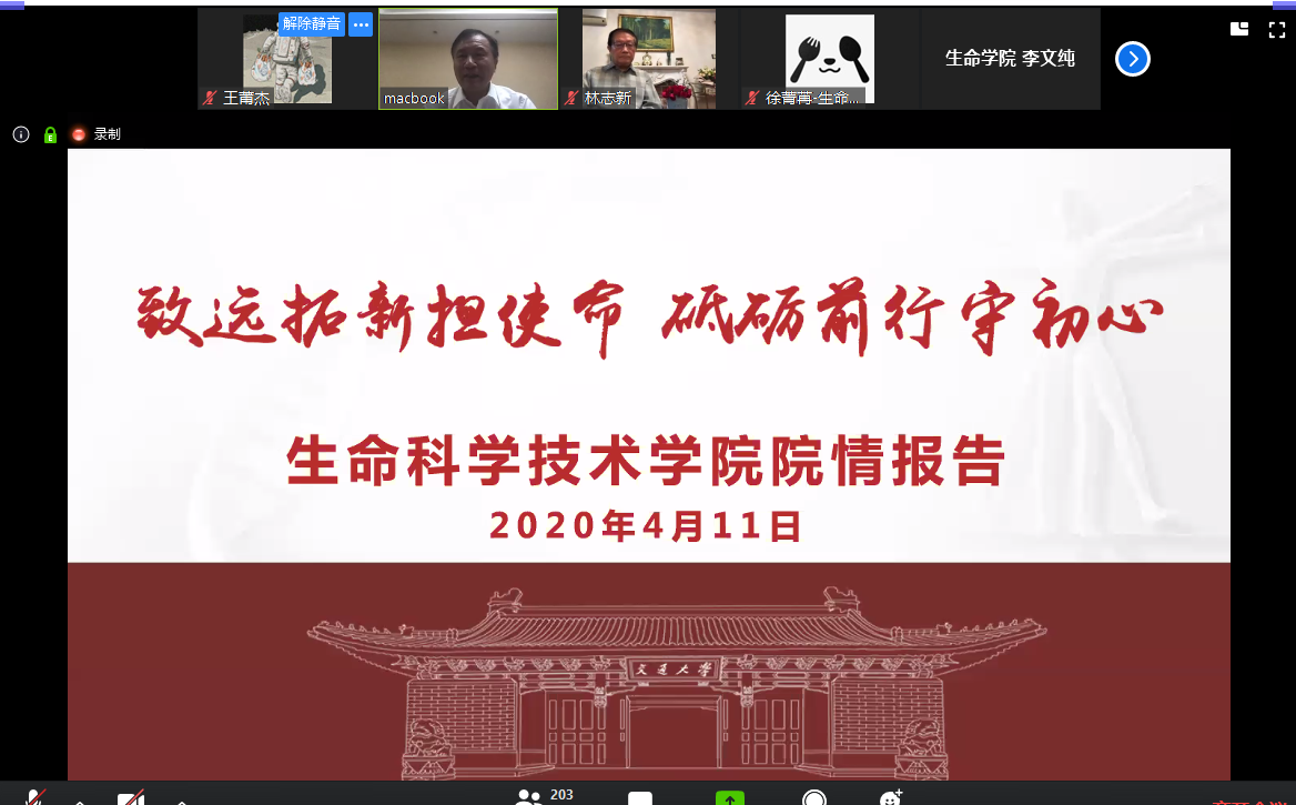在全球抗“疫”的特殊时期,36365线路检测登录入口结合学院自身特色,组织开展生科人“云团聚”活动,共庆母校建校124周年华诞。本次活动采用了线上形式,通过Zoom平台云端相会。学院党委书记嵇绍岭,院长邓子新,前院长林志新,常务副院长冯雁,党委副书记李文纯,副院长李志勇、林双君等学院领导以及200余名师生、海内外校友相聚在“云教室”,共叙生科情。活动由李文纯主持。