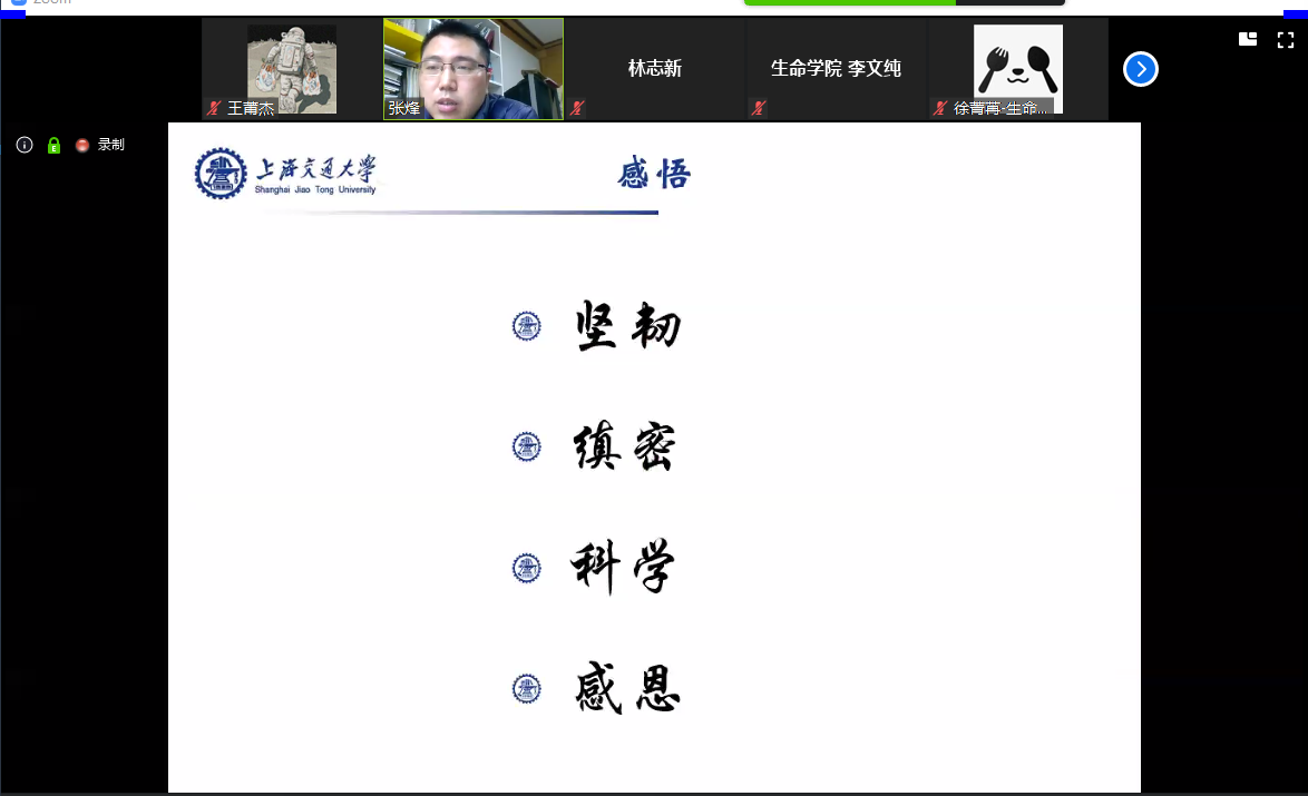 之后,三位在疫情防控过程中展现家国情怀的校友代表,与学院师生、校友分享了自己的战“疫”故事,彰显生科人的社会担当,弘扬战“疫”精神,厚植爱国情怀。学院2012级博士生,江南大学附属医院研究所主任技师,无锡市第一批援鄂医疗队队员张烽,在武汉抗“疫”斗争的最前线,努力用科研的力量,寻找着治愈新冠肺炎病毒的良方。他与大家分享了在武汉一线的抗疫经历,在此次疫情中他体悟最多的便是“坚韧,缜密,科学,感恩”,表明此亦为交大生科人的品德。学院1999级硕士生罗鹏现任上海鼎晶生物医药科技股份有限公司联合创始人,疫情防控期间,带领企业和全国各地的医疗工作者并肩战斗,为一线提供试剂盒、口罩、防护服等物资,价值超过200余万元。作为生物医药企业家,他从生物行业创业者的角度分享了他带领公司在疫情防控过程中,激活行业力量,贡献专业智慧,践行家国情怀的历程,他表示作为生物企业,要在抗疫中勇担使命,拥抱变化,贡献智慧和力量。学院2002级本科生、2006级硕士生,来自深圳华大基因总部的校友谢青,在疫情中自愿加入专家组,逆行武汉。他分享了团队建设“火眼实验室”的历程,极大助力了一线医学检测能力保障,在疫情防控中起到重要作用。