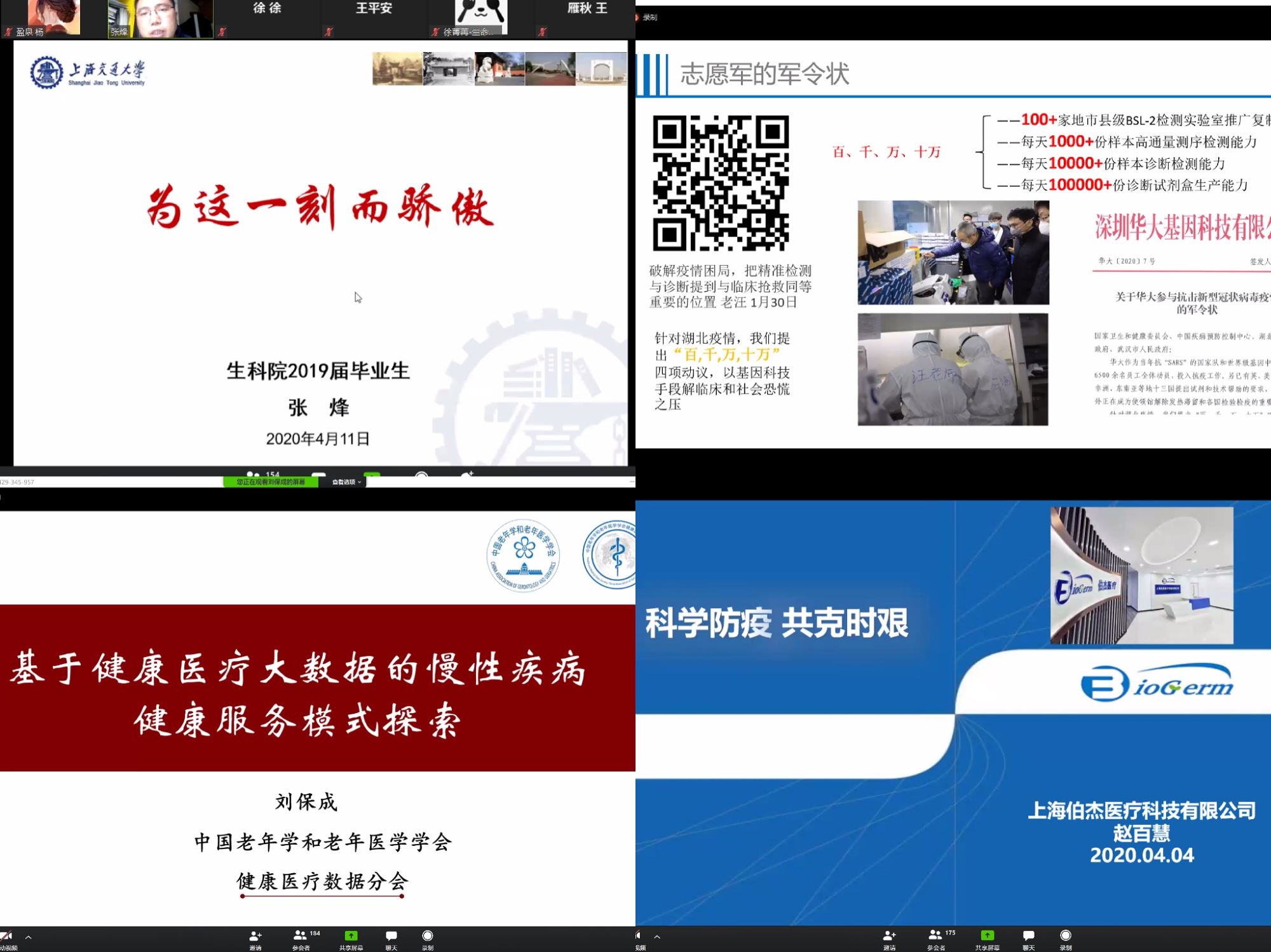 首先,校友张烽以“为这一刻而骄傲”为题与大家分享抗疫经验。他详细地介绍了他作为一线人员,从大年三十接到通知开始奋战53天的经历。接着,校友谢青以“睁开‘火眼’,走向世界”为题进行分享,讲述了他和他的同事们逆行武汉建设“火眼”实验室的经历,在疫情的预防、防控工作中积极贡献自己的力量。校友刘保成以“基于健康医疗大数据的慢性疾病健康服务模式探索”为题分享了他的工作经历,带领大家走进慢性病,让大家对于健康医疗大数据有了更加全面的认识。最后,2013级校友赵百慧以“科学防疫,共克时艰”为题分享了他带领公司在此次疫情中积极开展科学研究的经历。