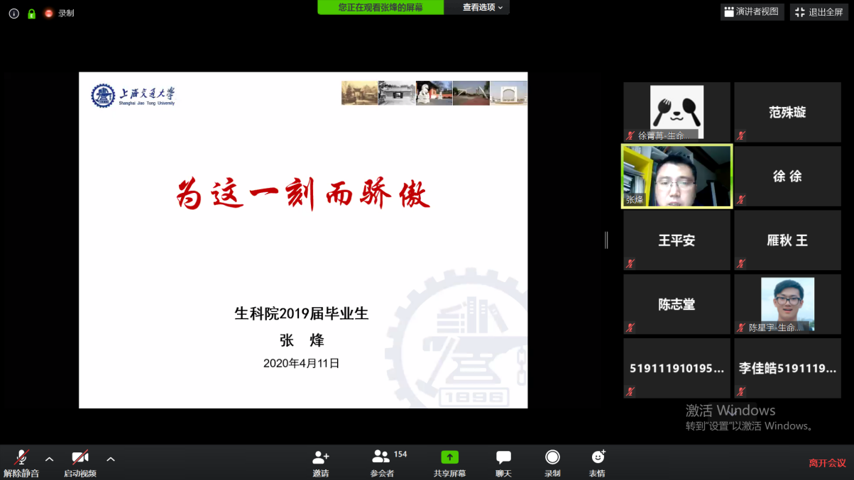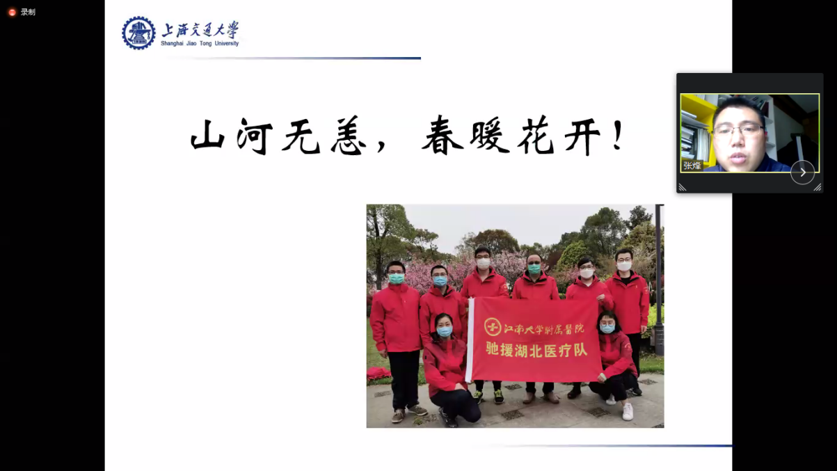 2020年4月11日喜迎交大124周年生日,在校友云端相聚之时,36365线路检测登录入口特别邀请4位参与抗疫的生科校友带来“战疫-生科人的责任与担当”主题教育活动。张烽、谢青、刘保成和赵百慧四位校友均为中共党员,为学院全体学生党员分享了生科人在这次新冠肺炎疫情中的战疫故事,会议由徐菁苒主持。