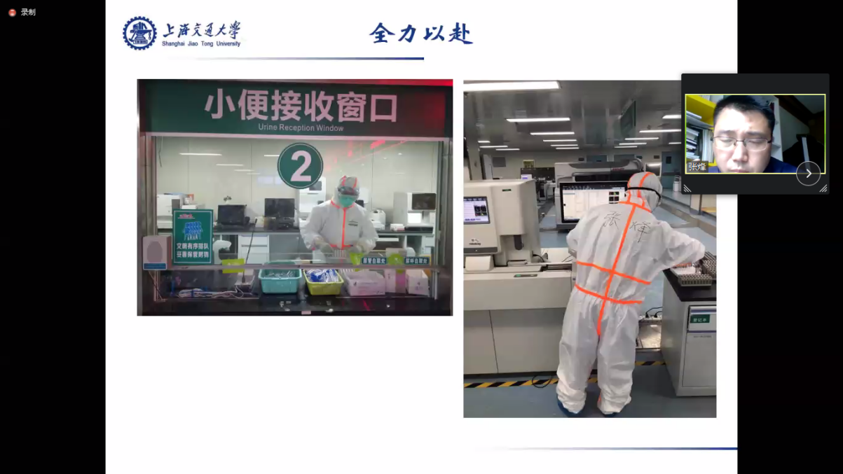 接下来,学院2002级本科生、2006级硕士生,来自深圳华大基因总部的校友谢青做报告,他在疫情中自愿加入专家组,逆行武汉。他分享了在中国及世界各国建设“火眼实验室”的历程,极大助力了一线医学检测能力保障,在疫情防控中起到关键作用。最后谢青表示,只有全球联合抗疫,人类才会取得战疫的最终胜利。