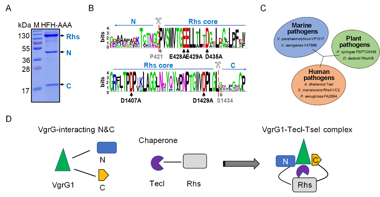 A:纯化后的 TseI 显示蛋白剪切为三段;B:TseI同源蛋白的序列对比显示保守氨基酸序列和N/C端自剪切位点;C:TseI同源蛋白在致病菌中的分布;D:分子内伴侣介导的TseI分泌模型。