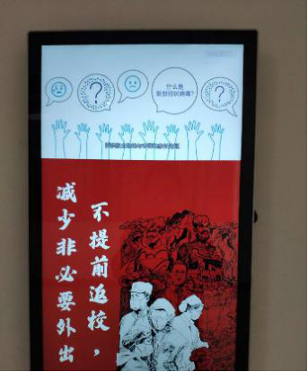 制作宣传材料、视频,多途径进行疫情防控宣传。学院大厅采用海报宣传“新冠病毒肺炎防控小贴士”,积极落实学生返校后办公室及实验室管理、个人防护指引。电梯门口宣传屏播放安全返校指南视频(教师版、学生版),提高师生的自我防护意识。