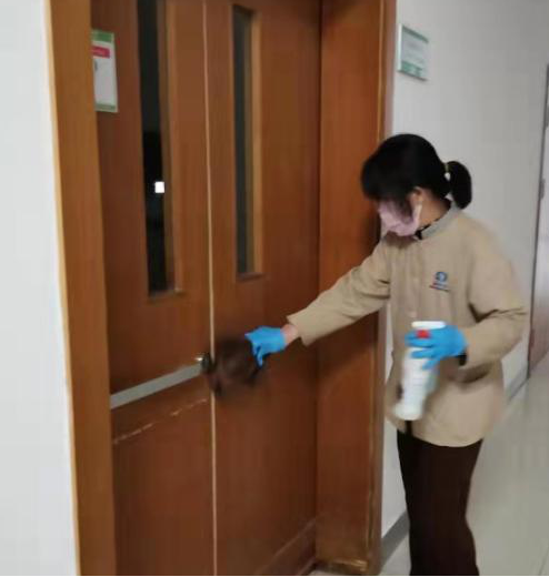 继续做好学院重点部位消毒杀菌工作。出入门拉手、楼层通道门拉手、窗框把手、楼梯扶手、电梯按钮、扶手不锈钢面板等部位每日用浓度为250-500mg/L的含氯消毒液擦拭消毒2次;走廊、电梯间、楼梯等部位每日用浓度为250-500mg/L的消毒液喷洒消毒1次;公共卫生间水龙头、门拉手等手接触区域每日用浓度为500mg/L的含氯消毒液擦拭消毒2次;地面、洗手盆、小便池、坐便器等区域每日使用浓度为500mg/L的含氯消毒液喷洒消毒2次。