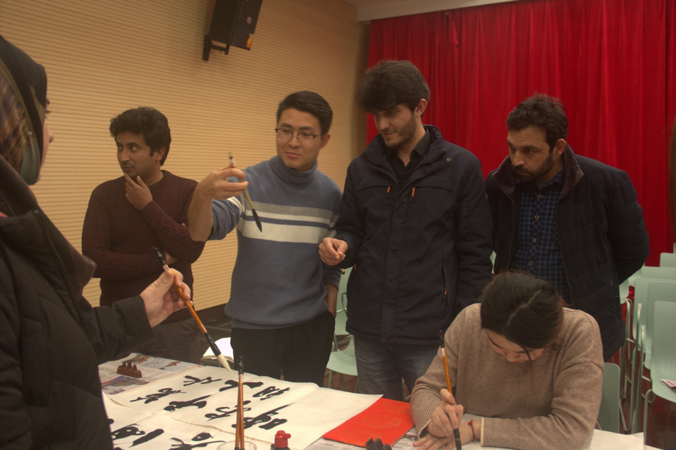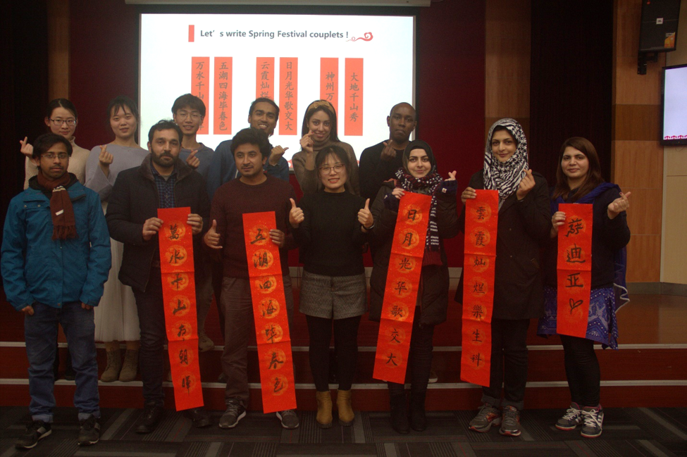 活动邀请了两位博士生焦兴志和刘梦婵为留学生们现场展示中国书法,并带领留学生写春联,使留学生切实地感受到中国书法的魅力,迫不及待动笔书写。
