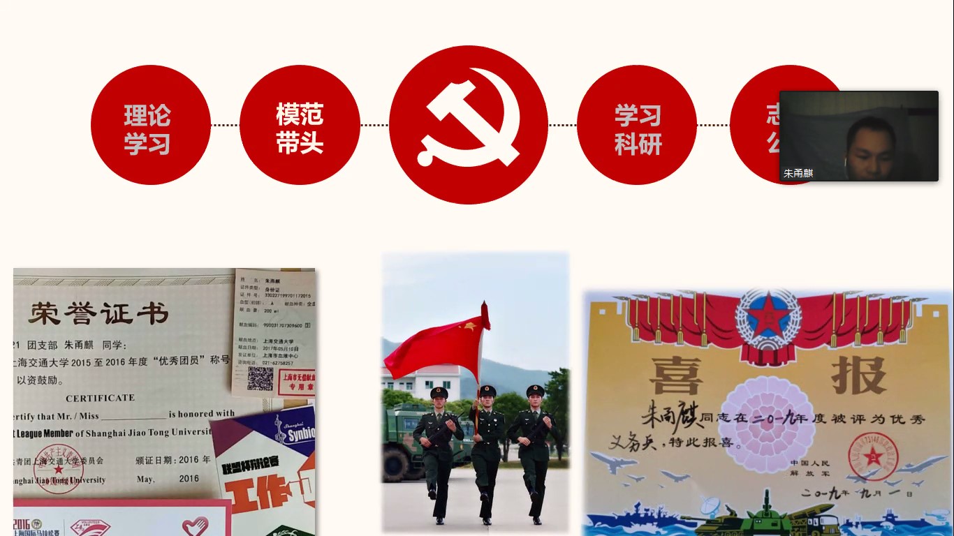 在谈到入党动机时,很多入党积极分子都表示受到了身边优秀党员同志的熏陶和教导。新疆籍本科生阿依土热克·艾力的爷爷作为建国后第一批从新疆赴清华大学学习的知识分子,在完成学业后放弃了留在北京发展的机会,毅然选择回到祖国西北地区为西部的发展脚踏实地做出贡献,完成自己作为共产党员的使命。在爷爷事迹的引领下,阿依土热克·艾力同学学习成绩优异,积极参与社会志愿服务工作,努力向党组织靠拢,时刻以党员的标准严格要求自己,得到了老师和同学的认可;另外两位入党积极分子崔家晨和朱甬麒曾在本科阶段参军,在入伍期间刻苦训练,磨练意志,更加坚定了加入党组织的决心,在返校后认真完成学业和科研工作,积极参加社会实践项目和志愿活动,为身边的同学树立了良好的榜样。