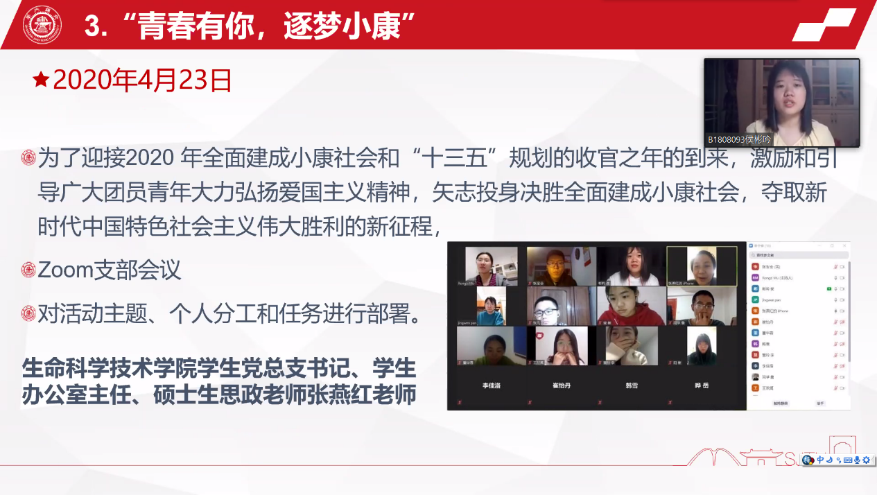 春季学期团日活动主要围绕“青春心向党,奋力建小康”主题开展。2020年是全面建成小康社会和“十三五”规划的收官之年,各团支部响应党中央的号召,激励和引导广大团员青年大力弘扬爱国主义精神,矢志投身决胜全面建成小康社会,夺取新时代中国特色社会主义伟大胜利的新征程。团日活动答辩评审会上,各个团支部展现出形式多样、内容丰富的团日活动项目,在学习工作的同时,提高团员自身素养,不断向党组织靠拢。