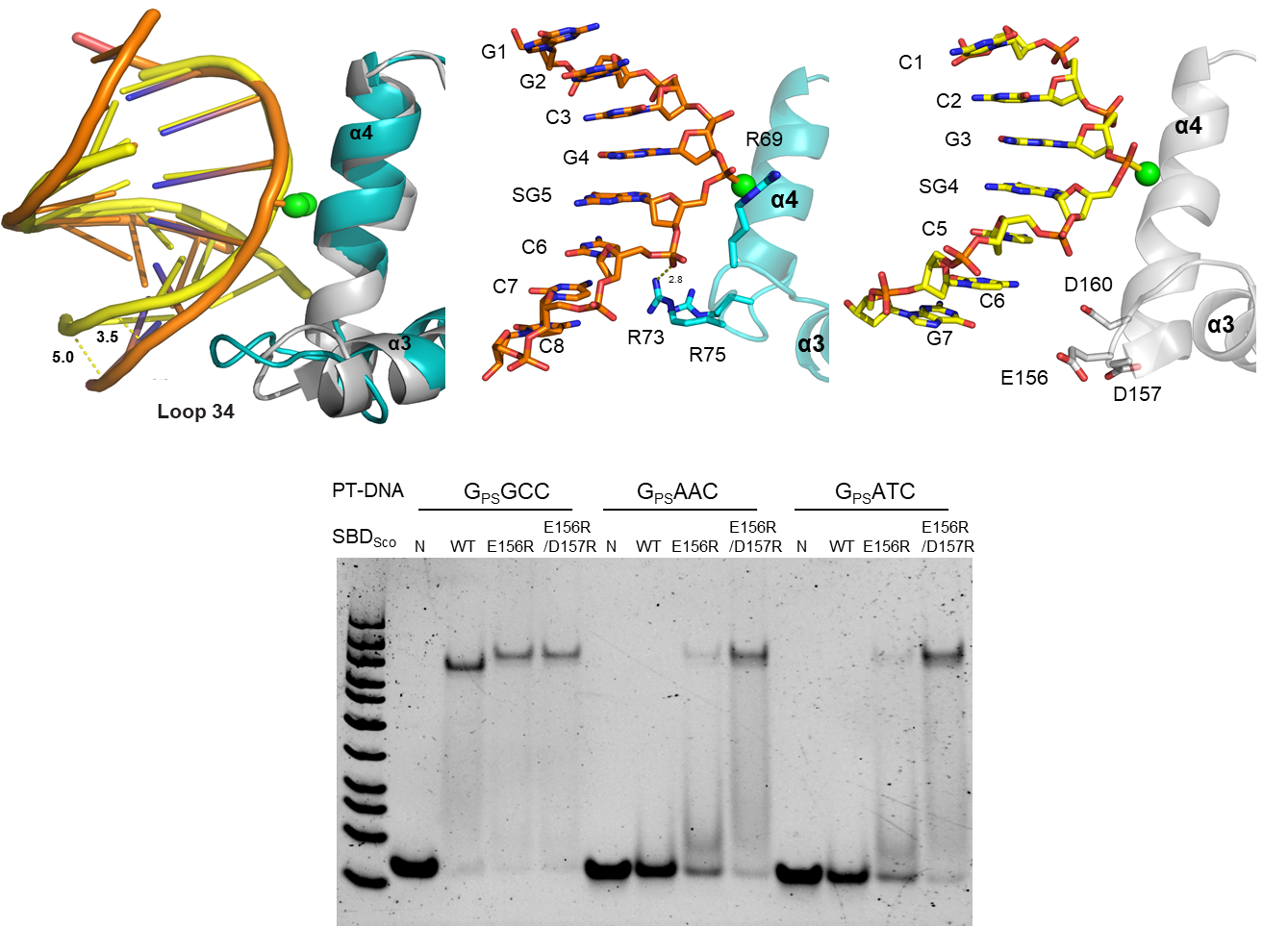 图1: SBDSco中与DNA骨架的静电作用从相互排斥改变为相互吸引之后,突变的蛋白获得了对另外几种DNA硫修饰序列的识别。