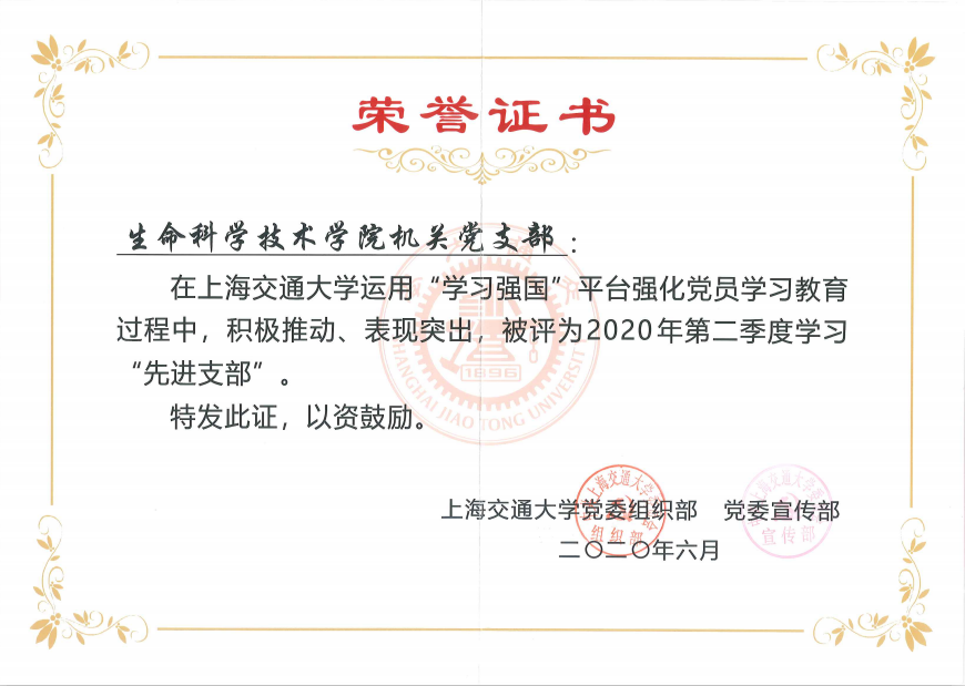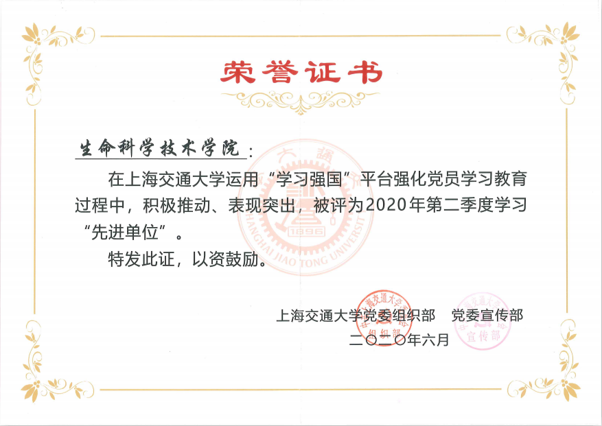 在36365线路检测登录入口2020年第二季度“学习强国”学习先进单位、先进党支部、先进个人评选中,36365线路检测登录入口获评第二季度学习“先进单位”,机关党支部获评学习“先进党支部”,微生物科学系生化系研究生联合党支部 周子画、本科生党支部 陈星宇、遗传与发育科学系研究生第一党支部 石垒、Bio-X研究生第一党支部 陈志堂、生物信息学与生物统计学系研究生党支部 毛雪莹、机关党支部 张燕红、生物信息学与生物统计学系研究生党支部 田晓翩、遗传与发育科学系研究生第一党支部 冉晓茹、Bio-X教工党支部 杨峰平、Bio-X研究生第一党支部 车曼菊10名党员同志获评36365线路检测登录入口2020年第二季度“学习达人”荣誉称号。