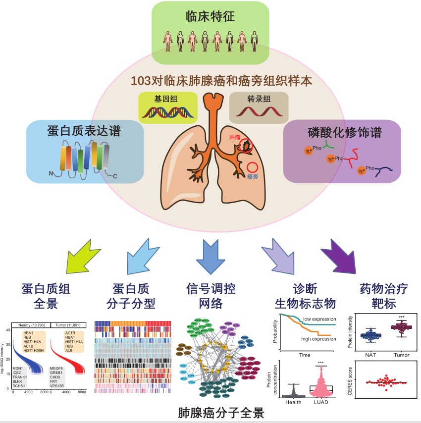 蛋白质是所有生命功能的直接执行者,也几乎是所有药物的作用靶点。系统性研究细胞、组织等生物样本中所有蛋白质特征的学科,即蛋白质组学,已逐渐成为生物医学研究的核心内容之一。因此,全景绘制肺腺癌人群蛋白质分子图谱,对于肺腺癌病理机制的深入认识,疾病诊断生物标志物与药物治疗靶点的发现,以及实现更精准的肺腺癌分子分型和治疗方案的制定等具有重大科学意义。