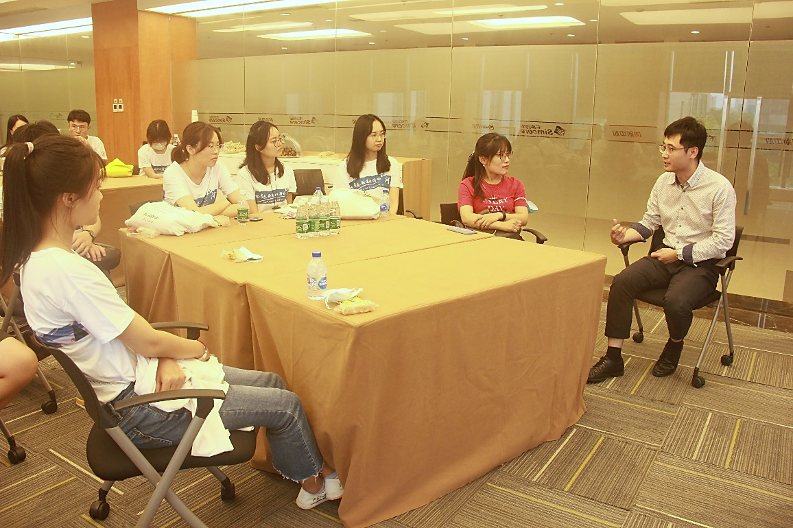 实验室参观结束后,陈怡给实践团成员详细介绍了公司的研发实力、团队水平和产品布局,并就生物医药领域的未来发展分享了自己的看法。随后36365线路检测登录入口校友、任职于先声药业研发部门的徐祖朋给实践团成员们分享自己的经历以及对就业择业的看法。徐祖朋曾任职过多家企业,就第一份工作的选择以及职业的转换给同学们提供了宝贵建议。