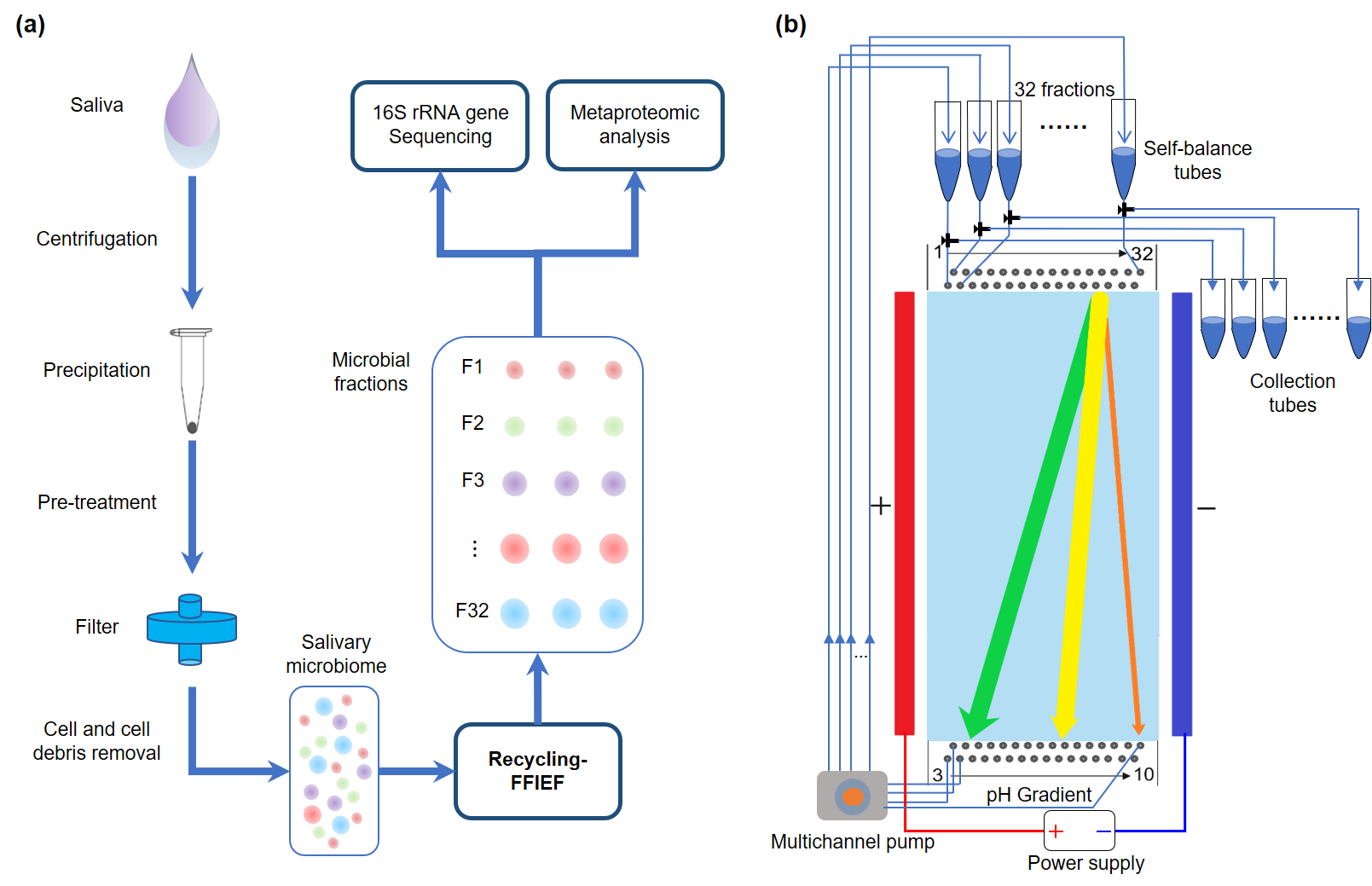 人体的微生物组与人类健康密切相关,近年来对于肠道微生物组和口腔微生物组的组成和功能研究日益受到重视。口腔作为人体中仅次于肠道的第二大微生物聚集地,包含着超过700种的不同微生物,在调节代谢和免疫等方面发挥着独特的作用。多项研究表明,口腔微生物组成的变化与龋齿、牙周炎、口腔癌、肺癌、胰腺癌以及类风湿性关节炎等疾病息息相关。然而,目前的研究表明,基于PCR的扩增技术可能会因样品中的冗余基因序列而产生偏差;高丰度微生物的存在会严重影响非优势菌群的解析;基于质谱的宏蛋白质组学技术也受限于高丰度人源蛋白的干扰,对低丰度微生物的蛋白分析束手无策。针对这些挑战,该项工作利用自由流等电聚焦电泳建立了微生物组的高效分离和富集新方法,从根本上降低了高丰度微生物和人源细胞蛋白对低丰度微生物鉴定的影响,显著提高了对微生物组的解析和鉴定能力,为深度挖掘微生物组、开展组成和功能等研究提供了新颖的上游技术。