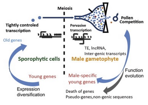由于大部分植物没有性染色体,且植物中广泛存在全基因组复制事件,因此植物中的新基因是如何起源的,一直是植物学家关注的问题。张大兵教授团队利用转录组年龄分析方法,对植物转录组大数据进行深入挖掘,发现植物雄性生殖细胞的转录组在进化意义上比其它组织的转录组更为年轻,这反映出植物雄性配子体可能存在普遍转录状态,这种状态是促进新基因出现的有利条件。